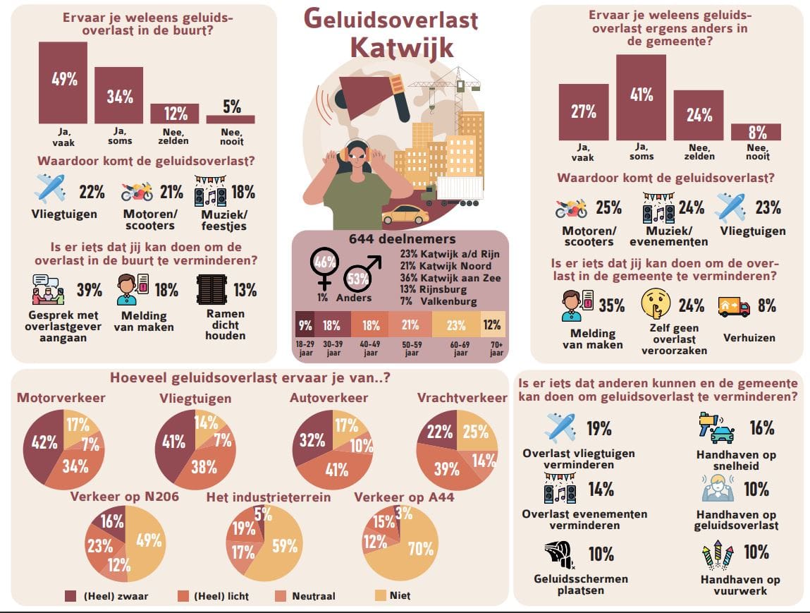 Van 21 augustus tot 11 september is een vragenlijst over geluidsoverlast verspreid onder inwoners van de gemeente Katwijk. Deze vragenlijst is opgesteld met Pro Public, een organisatie die zich specialiseert in enquêtes, analyses en peilingen onder inwoners van gemeenten. 644 inwoners hebben de vragenlijst ingevuld. In de vragenlijst een onderscheid gemaakt tussen geluidsoverlast in de directe omgeving en op andere plekken in de gemeente. Het kan immers zo zijn dat iemand thuis geen overlast ervaart, maar bijvoorbeeld wel op het werk of tijdens het uitgaan.