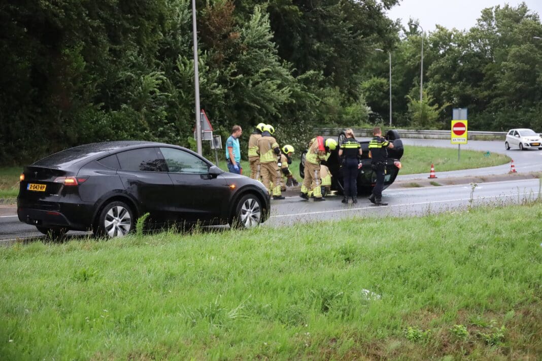 Bij de oprit naar de N206 ter hoogte van de Ambachtsweg in Katwijk is maandagavond een auto op de kop terechtgekomen. De auto kwam vanaf de N206 en belandde op de oprit.