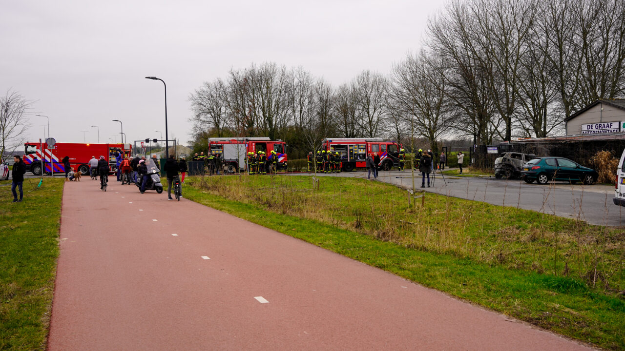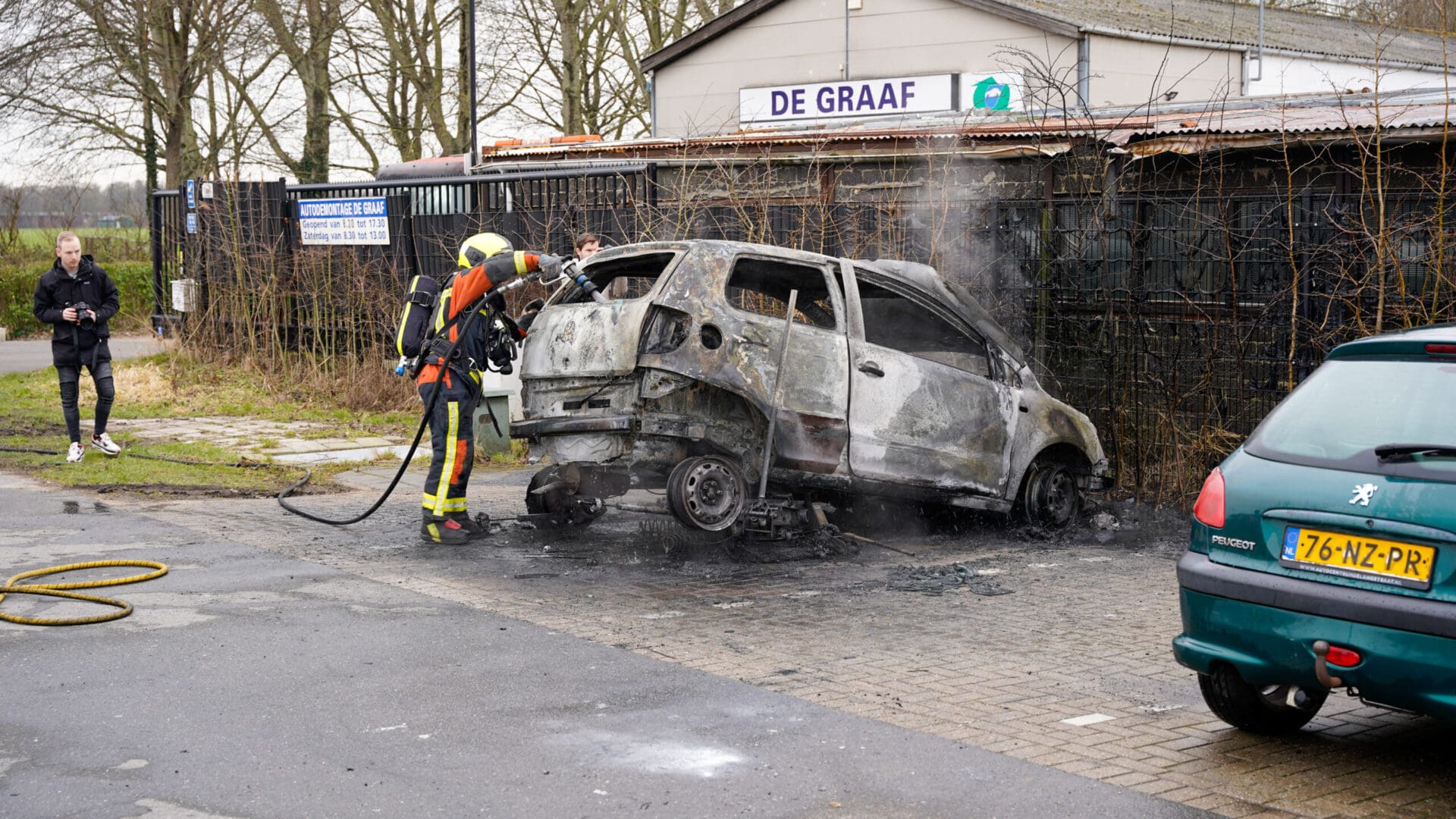 Op de parkeerplaats van een autosloperij langs de Ommedijkseweg bij het Valkenburgse Meer is zondag aan het begin van de middag een auto volledig verwoest door brand.