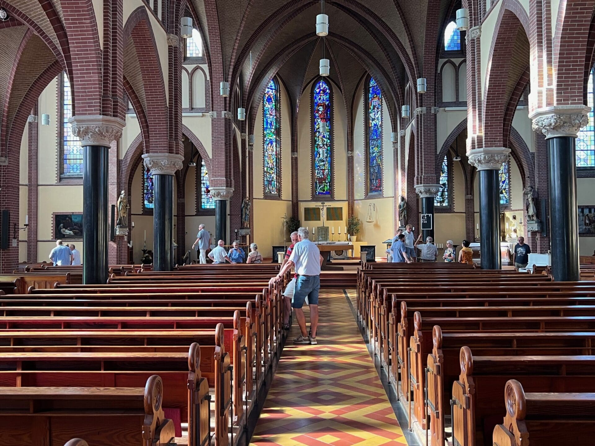 U zult zich verbazen over het interieur van deze kerk, neem de glas-in-loodramen boven het hoofdaltaar, van de Maastrichtse glazenier Huub Levigne, uit 1948 en het glas-in-loodwerk in de kruiskapellen van Balendong uit 1950. Vele bezoekers hebben ook bewondering voor de kruiswegstaties, geschilderd door de bouwpastoor Hendriks in de jaren 1916-1920. De figuren op de doeken zijn o.a. parochianen die model hebben gestaan. Zoekplaatje voor de bezoekers, de pastoor heeft zichzelf ook ingeschilderd. Op welke van de veertien staties kun je hem zien? Kijk ook even naar de pilaren, deze komen uit de steengroeven van de rivier de Ourthe en heten daarom ‘Petit basalt d’Ourthe’. Zoek naar de fossielen van beestjes en schelpen in deze pilaren. Ook graag uw aandacht voor het ‘Rococo-altaar’ van rond 1760 en afkomstig uit het r.-k Jongensweeshuis in Amsterdam. Werkelijk een icoon op zich. Voor het hoofdaltaar staat nog een altaar. Waarom? Dat hoort u vast bij de rondleiding.