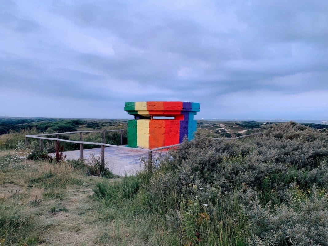 De bunker op het koepelduin is in de regenboogkleuren geschilderd. Dat is te zien op jongerenwebsite Kattuk.nl.