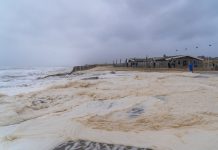 Voor de Katwijkse kust staat het water maandagmiddag rond half drie erg hoog. De betonblokken waar vanaf normaal het strand te betreden is, zijn...