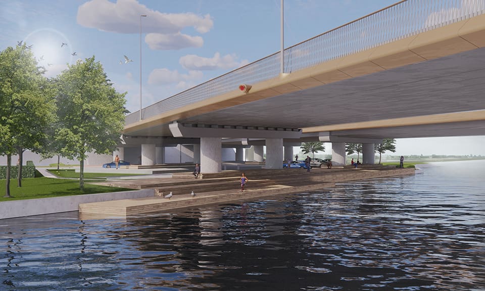 Over de Oude Rijn liggen nu twee Torenvlietbruggen: de nieuwe brug waar het verkeer al overheen rijdt en de bestaande Torenvlietbrug die opgeknapt wordt. Net als voor de Torenvlietbrug zelf, is er veel aandacht besteed aan het ontwerp en de inrichting ónder de brug. Benieuwd hoe het er onder de brug uit komt te zien? Bekijk dan de visualisaties van de eindsituatie.