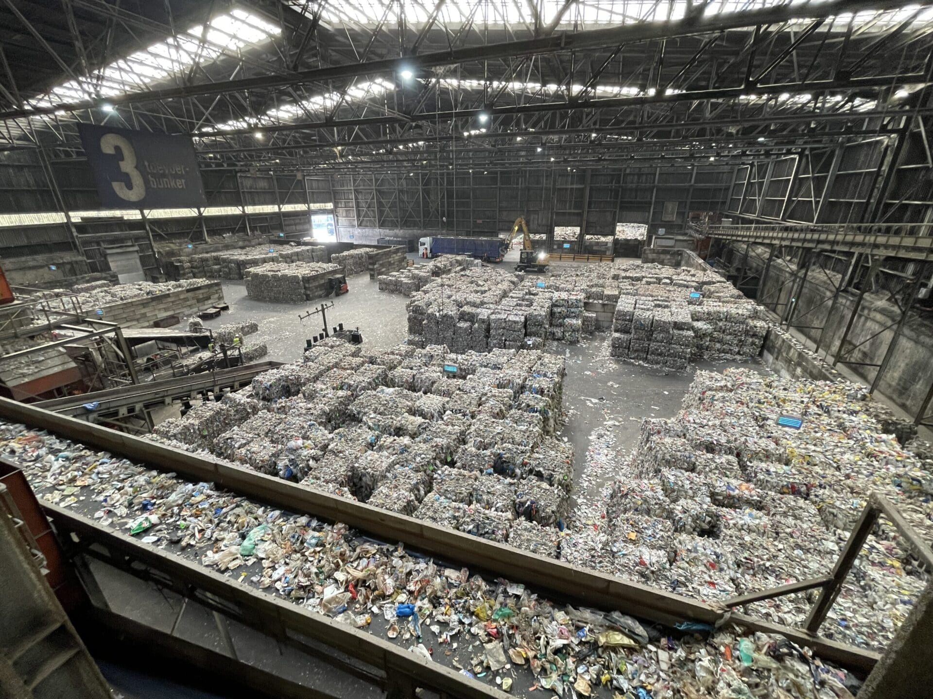Nadat de machine het pmd heeft gesorteerd, worden de verschillende soorten plastic in grote balen samengepakt.