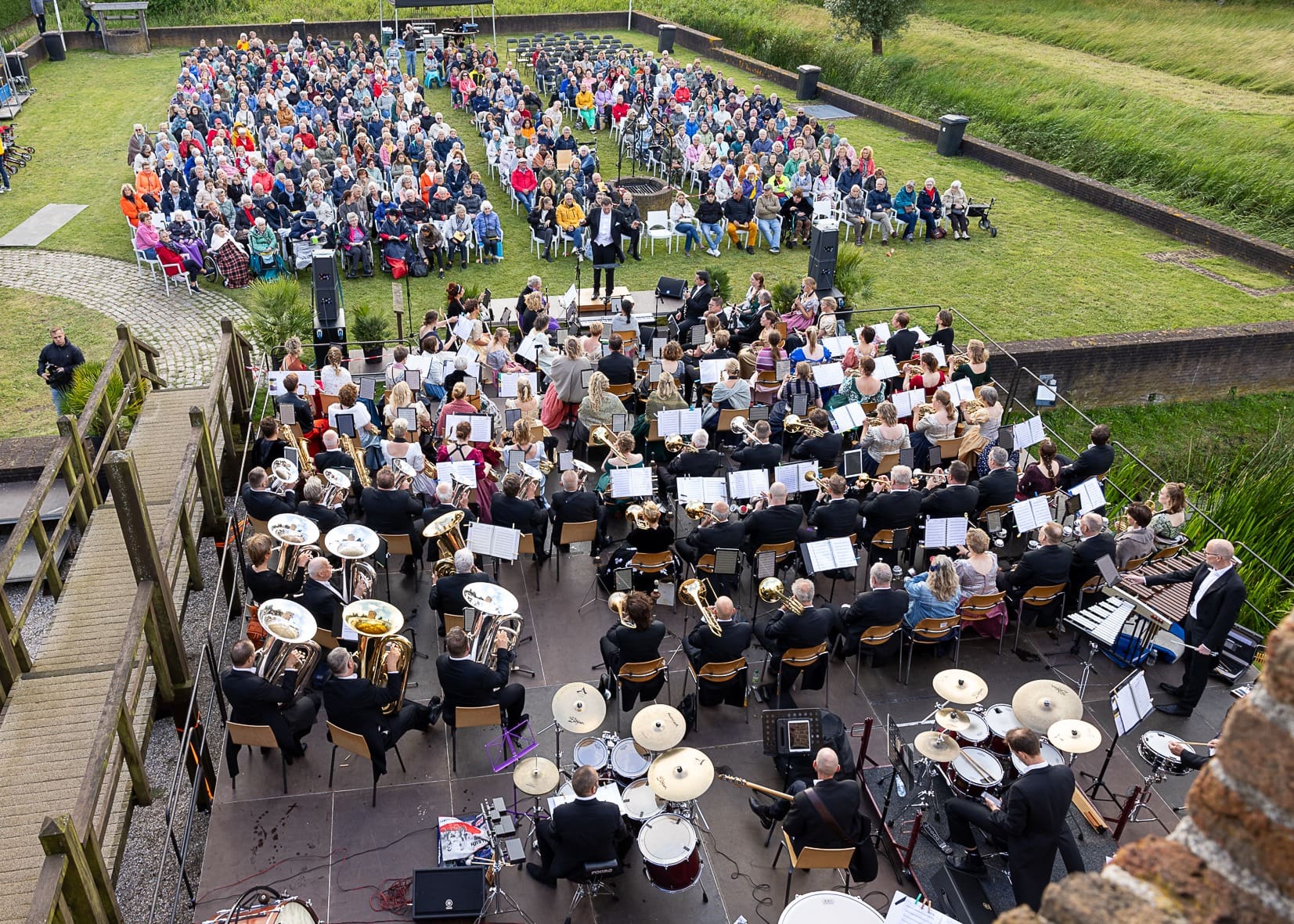 Even dreigde het weer op zaterdag 6 juli een uniek concert in de kasteeltuin van ‘t Huys Dever te verstoren. Donkere wolken dreven echter over, waardoor het buitenconcert van de harmonie van Da Capo met Harmonie Katwijk toch doorgang kon vinden. De zomerstorm waaide op tijd weg zodat ruim 350 bezoekers hebben kunnen genieten van een bijzondere muzikale avond.