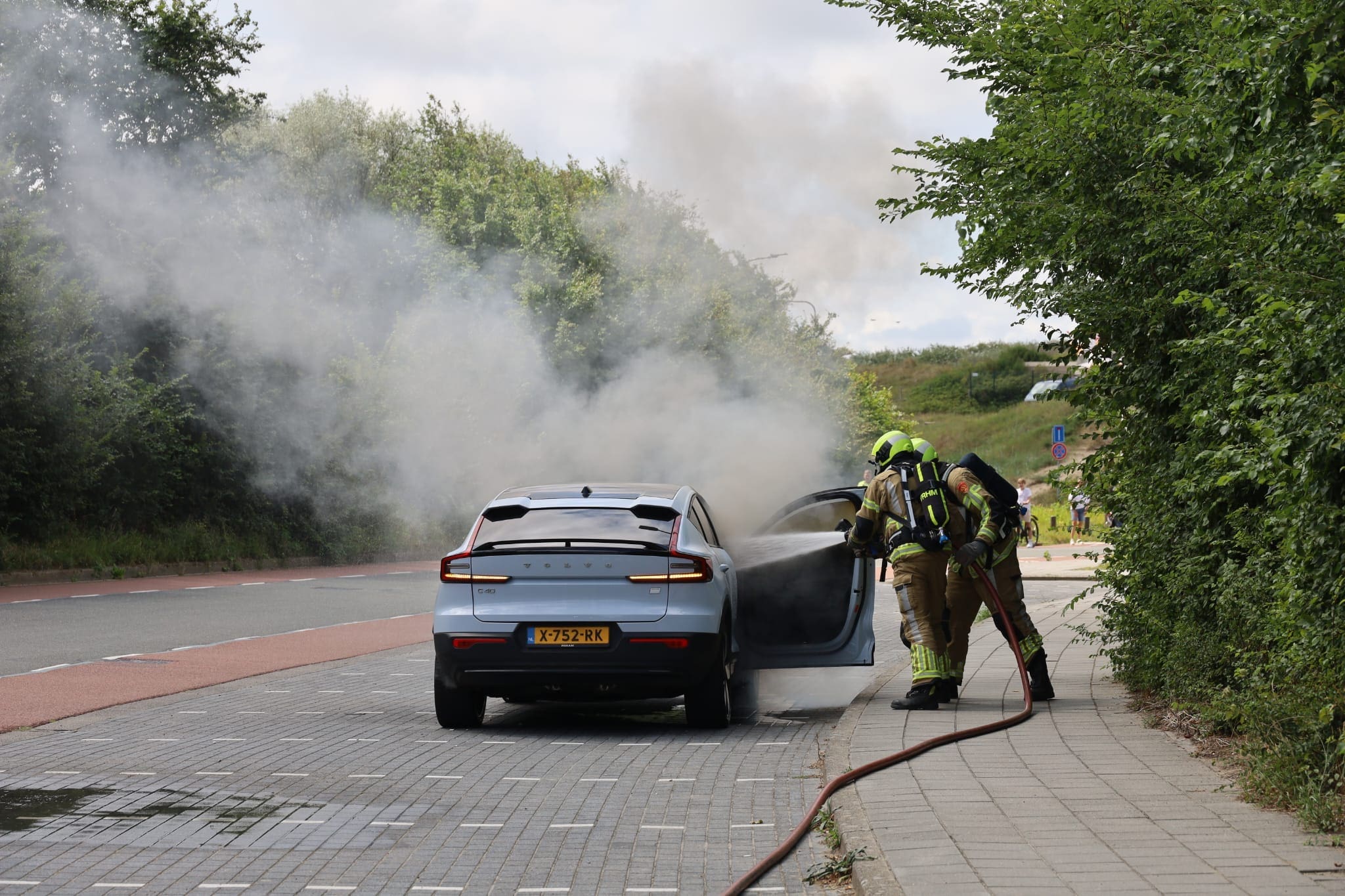 De automobilist was onderweg om karton weg te brengen toen hij een smeulende geur opmerkte. Kort daarna kwam er rook uit het voertuig. Hij zette de auto langs de kant van de weg, waarna het vuur zich snel verspreidde. Het voertuig, een elektrische Volvo C40 met een nieuwwaarde van 64.175 euro, raakte zwaar beschadigd.