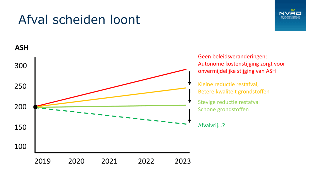 Als die gemeente geen maatregelen neemt, betaalt men in 2023 300 euro. Neemt de gemeente enkele maatregelen blijft de stijging beperkt tot 250 euro. Zorgt de gemeente voor een stevige reductie van het restafval, blijven de kosten gelijk op 200 euro. Een verlaging zit er niet aan te komen, mits een gemeente volledig restafval vrij wordt, en dat is nu niet realistisch.