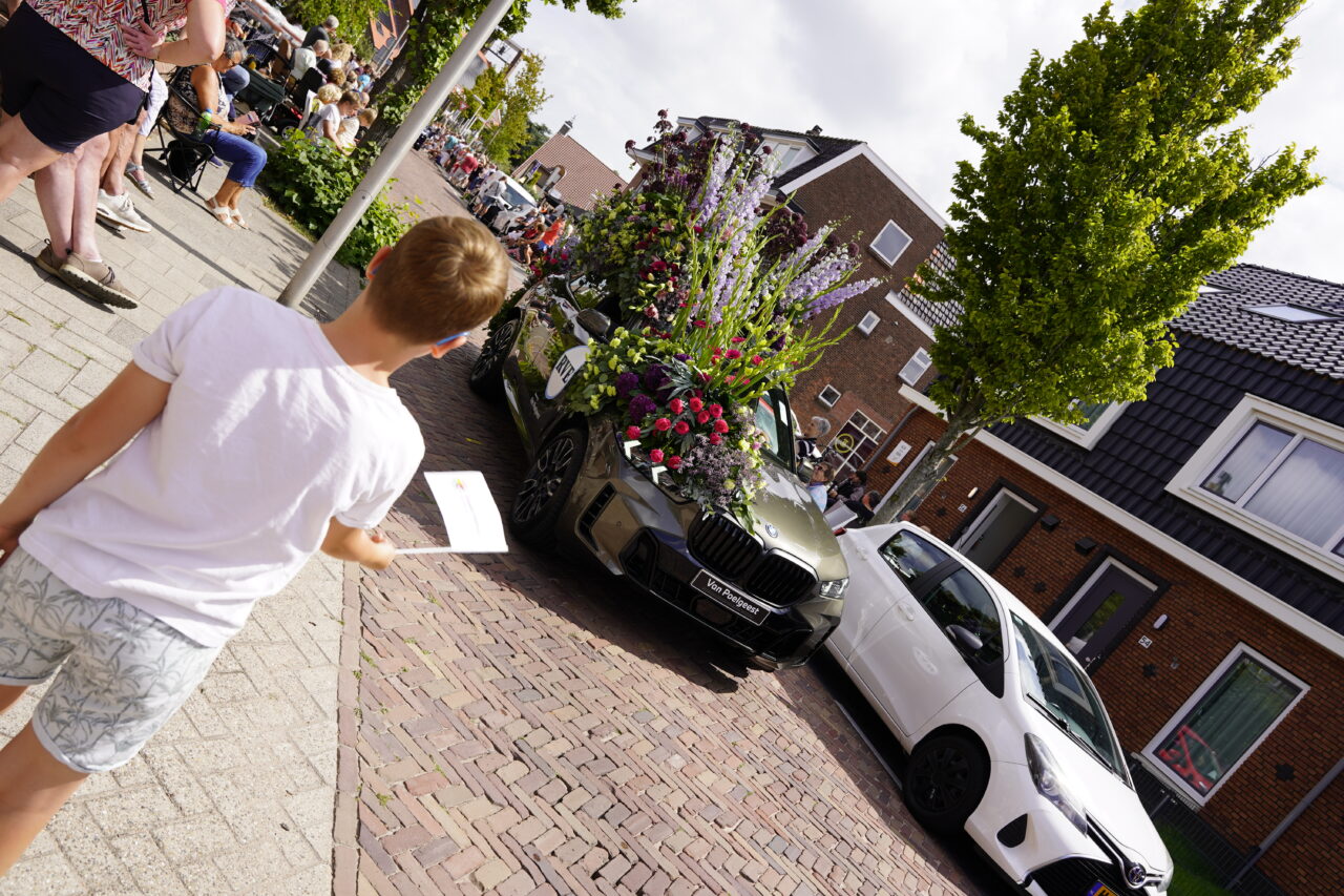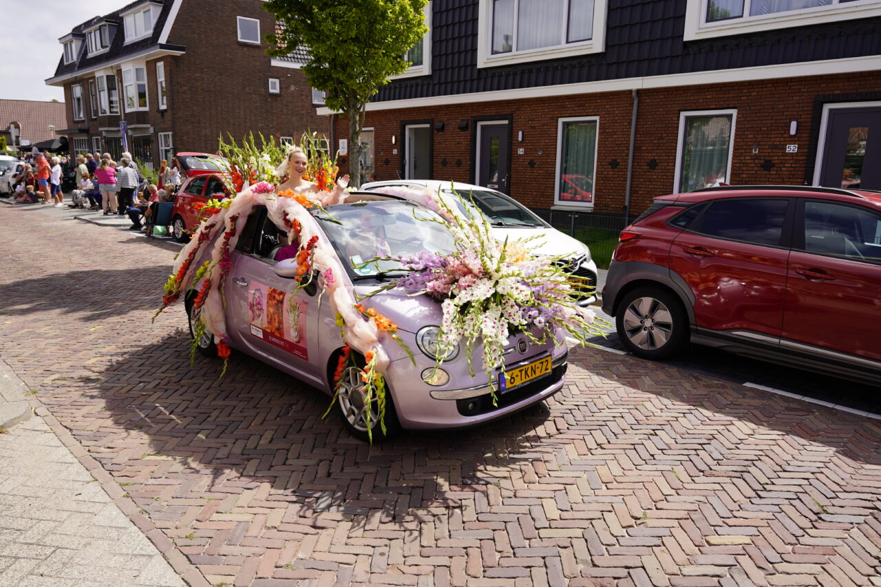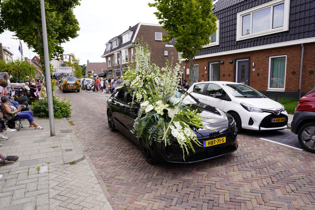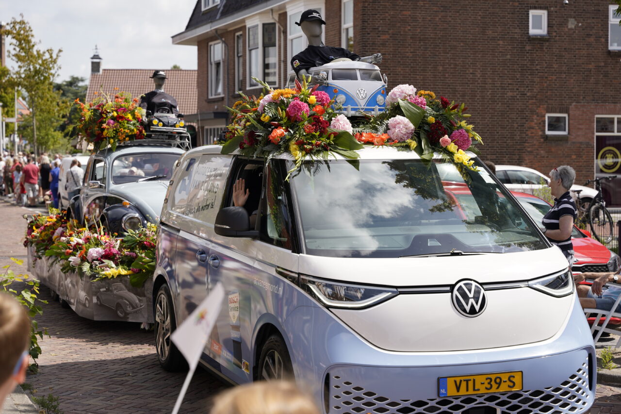 De parade bood variatie in voertuigen, van klassieke oldtimers tot moderne elektrische auto’s, aangevuld met bloemstukken op fietsen, motoren en kleinere wagens.