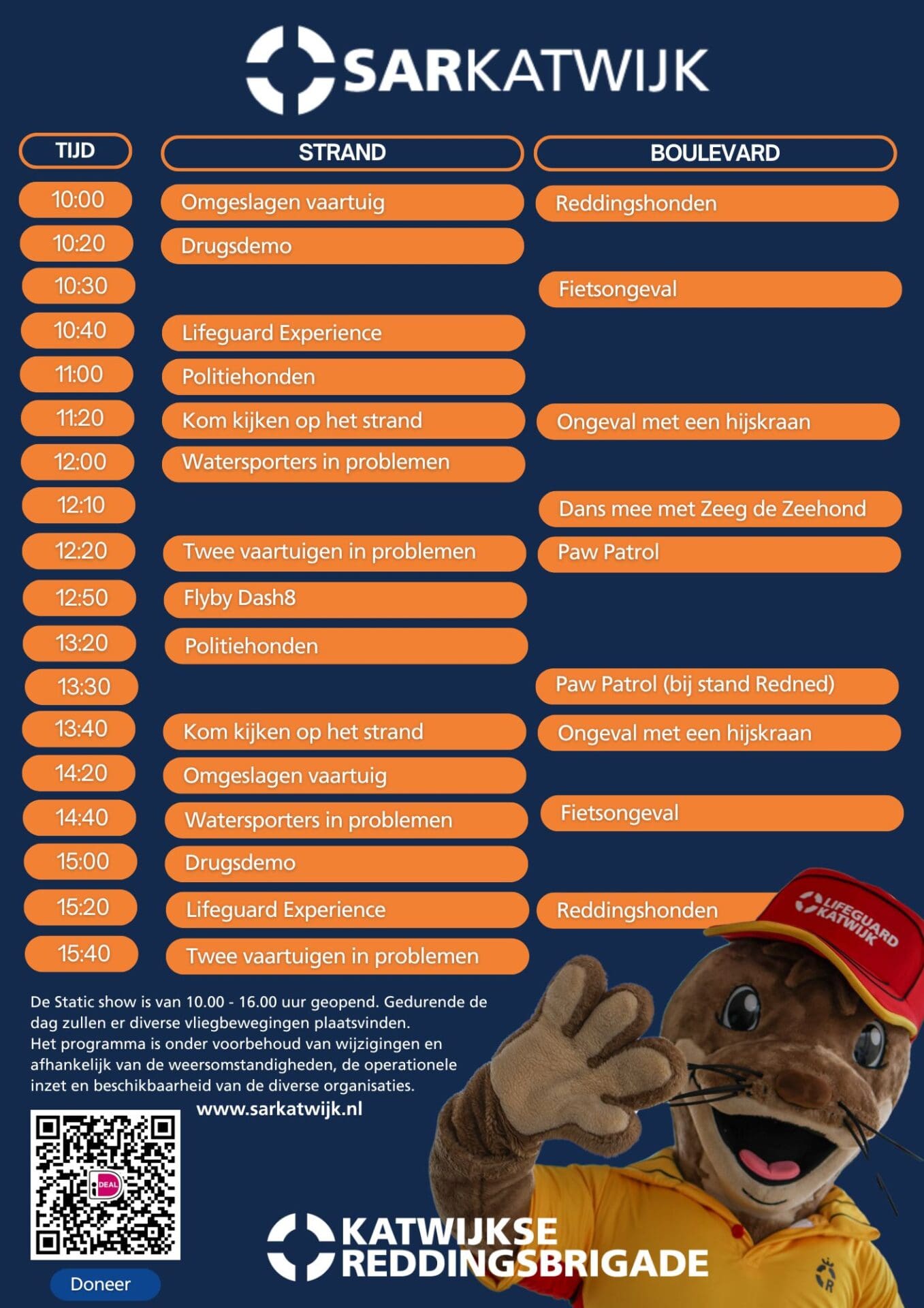 Op het programma staan realistische demonstraties op het strand, de boulevard, op zee en in de lucht. Denk aan een groots opgezet ongeval met meerdere hulpdiensten, zoek- en reddingsacties op zee, inzet van reddingshonden en indrukwekkende ondersteuning vanuit de lucht door helikopters en een fly-by van het patrouillevliegtuig van de Kustwacht, de Dash8.