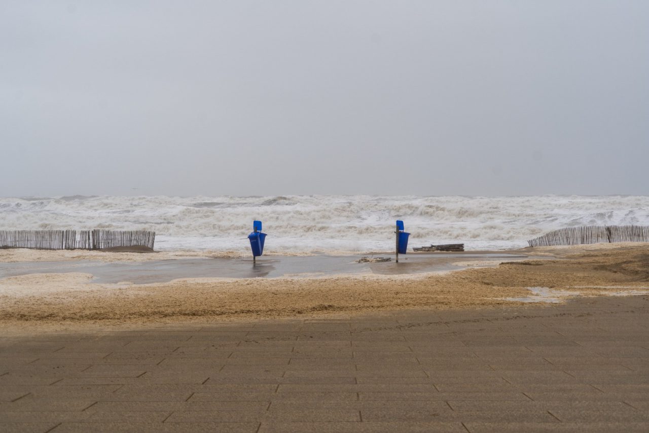 Blauwe vuilnisbakken en houten hekken zijn omgewaaid en overspoeld. Diverse Katwijkers nemen een kijkje om het natuurgeweld te aanschouwen.