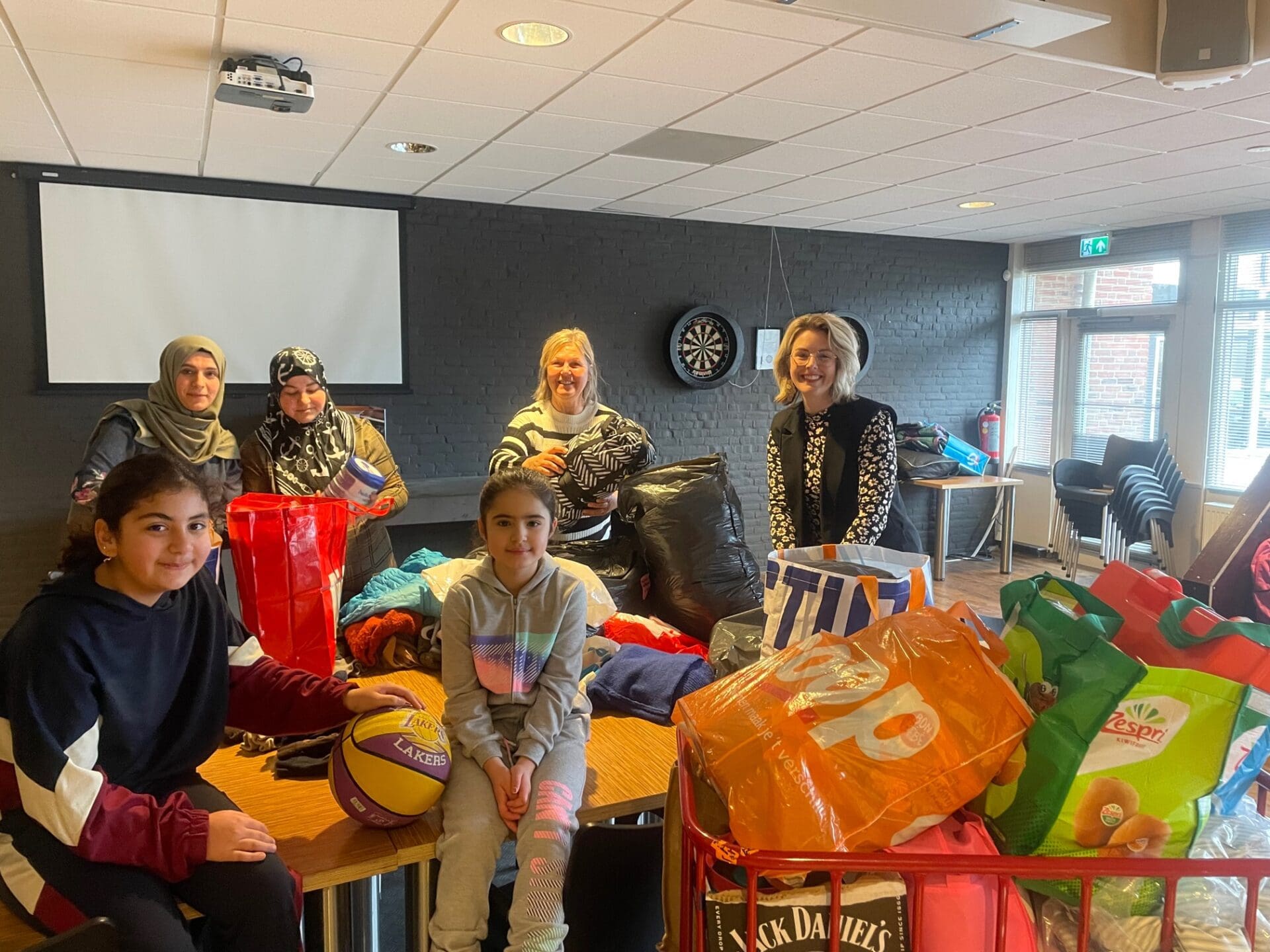 Op de foto Döndü Yasin en dochter Fatma Zehra en Samar Ghashim en Marwa Abdullah die de inzameling organiseerden, Mandy Varkevisser en Jacoline Plug met maar een klein deel van de op zaterdagmorgen ingezamelde spullen. Tot ’s avonds werden nog steeds spullen ingeleverd wat binnenkort op de bestemde plek heel goed gebruikt kunnen worden.