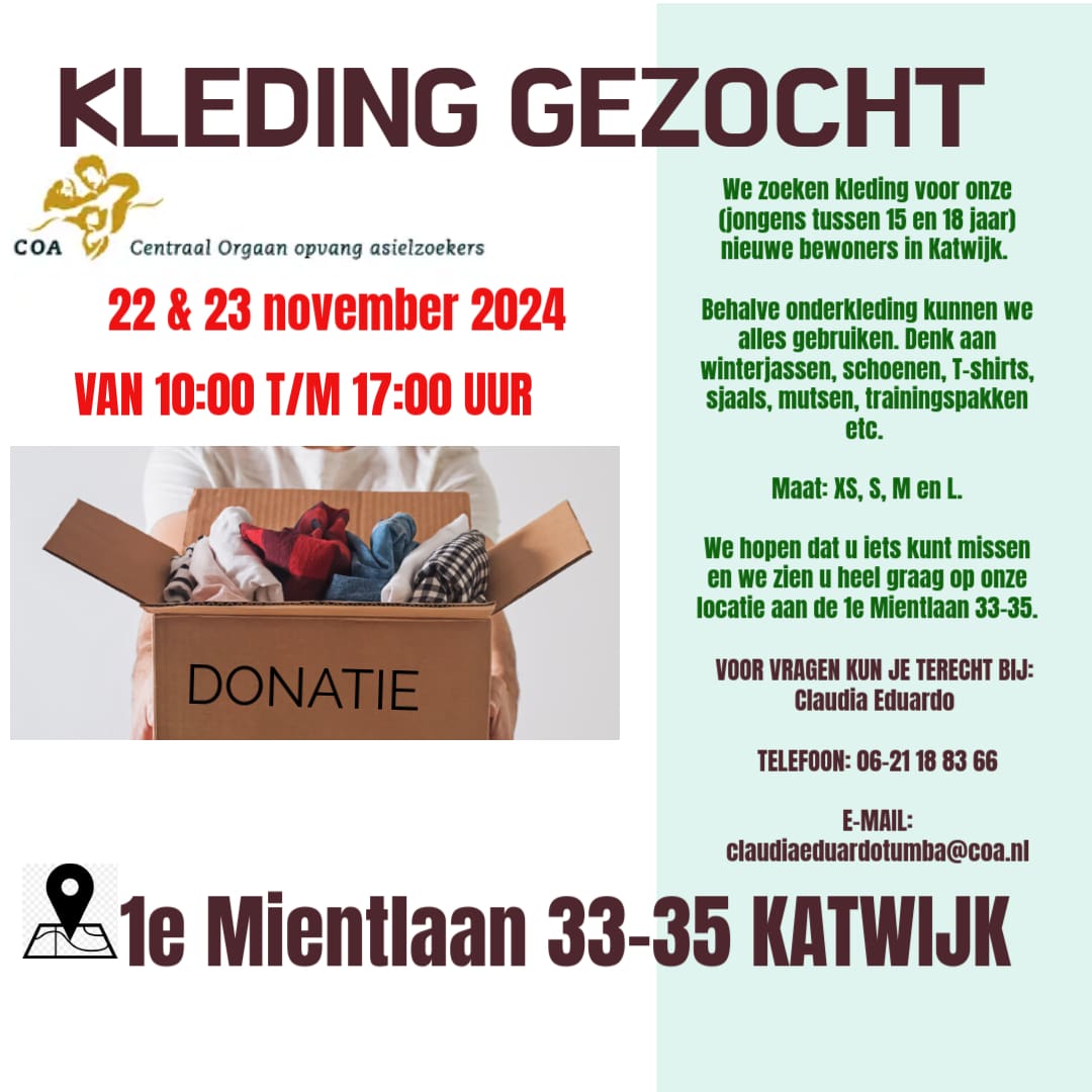 Het Centraal Orgaan opvang asielzoekers (COA) organiseert op 22 en 23 november een kledinginzameling voor nieuwe bewoners in Katwijk, specifiek gericht op jongens tussen de 15 en 18 jaar. De inzamelactie vindt plaats van 10.00 tot 17.00 uur aan de 1e Mientlaan 33-35.