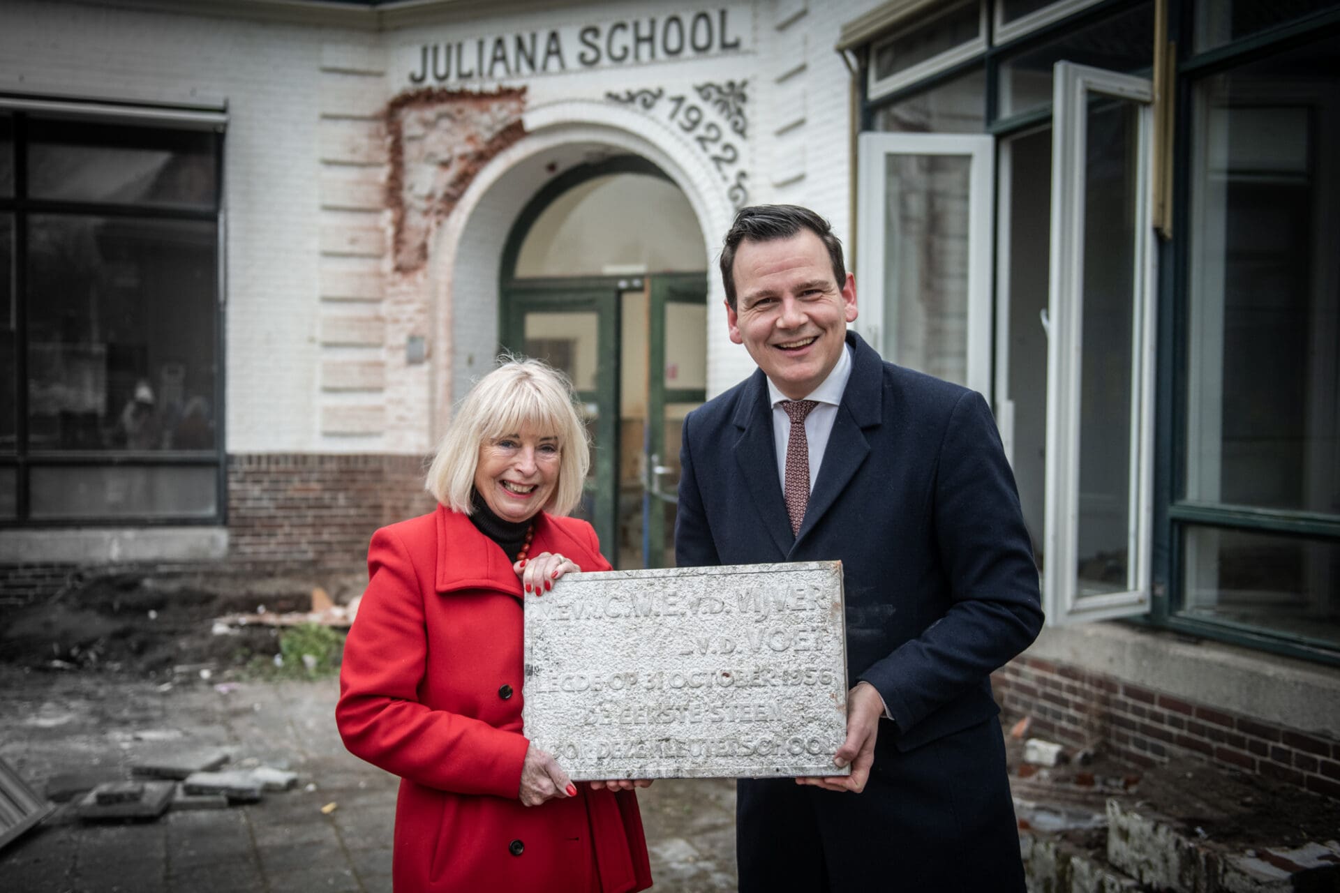 De sloop van de voormalige Julianaschool en kleuterschool De Vijverhof in Rijnsburg is officieel gestart. De scholen worden gesloopt voor de komst van een Knarrenhof. Bijzondere elementen zoals de kenmerkende sierbogen worden zoveel mogelijk behouden. Als eerbetoon gaf wethouder Mostert de eerste steen van De Vijverhof terug aan mevrouw Zandbergen.