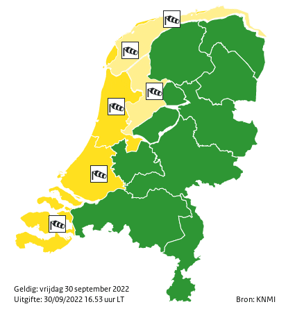 Het KNMI waarschuwt voor zware windstoten. Vanaf het einde van vanavond zijn er langs de kust zware windstoten mogelijk van 80-90 km/u. De wind komt eerst uit zuidwest, later uit west. Hiervan kunnen verkeer en buitenactiviteiten hinder ondervinden.