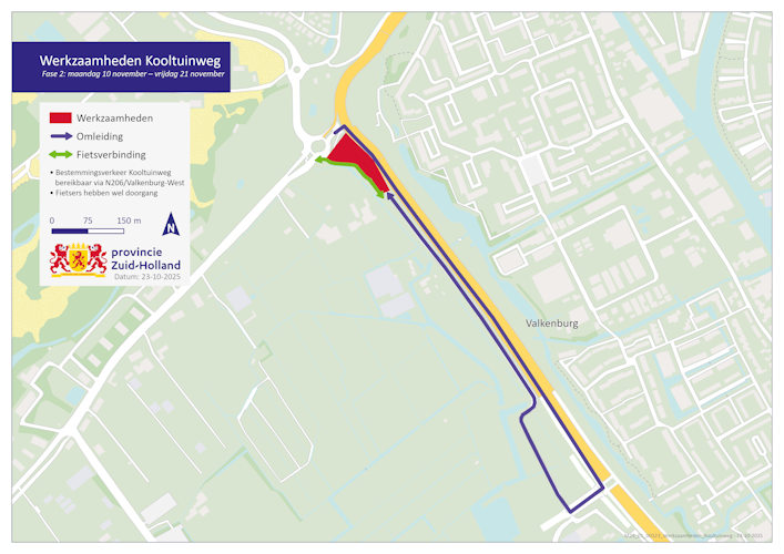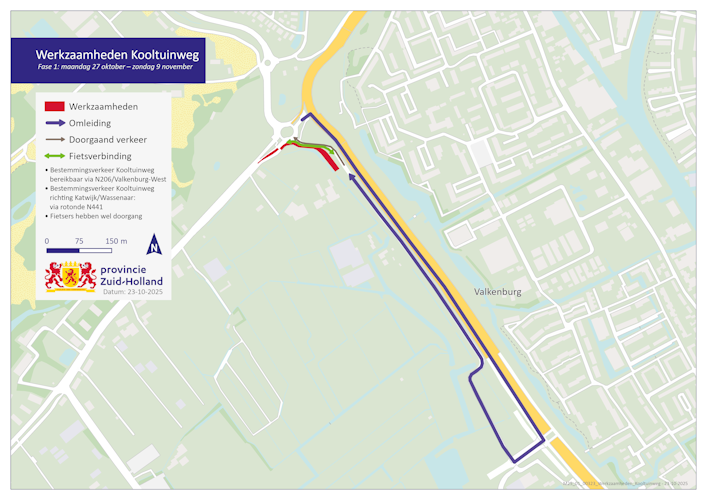 Van maandag 27 oktober tot en met vrijdag 21 november is de Kooltuinweg tussen de rotonde N441-N206 en Valkenburg-West gedeeltelijk afgesloten voor verkeer. De werkzaamheden maken deel uit van de aanleg van de R-net busbaan tussen Leiden en Katwijk en worden in twee fases uitgevoerd.