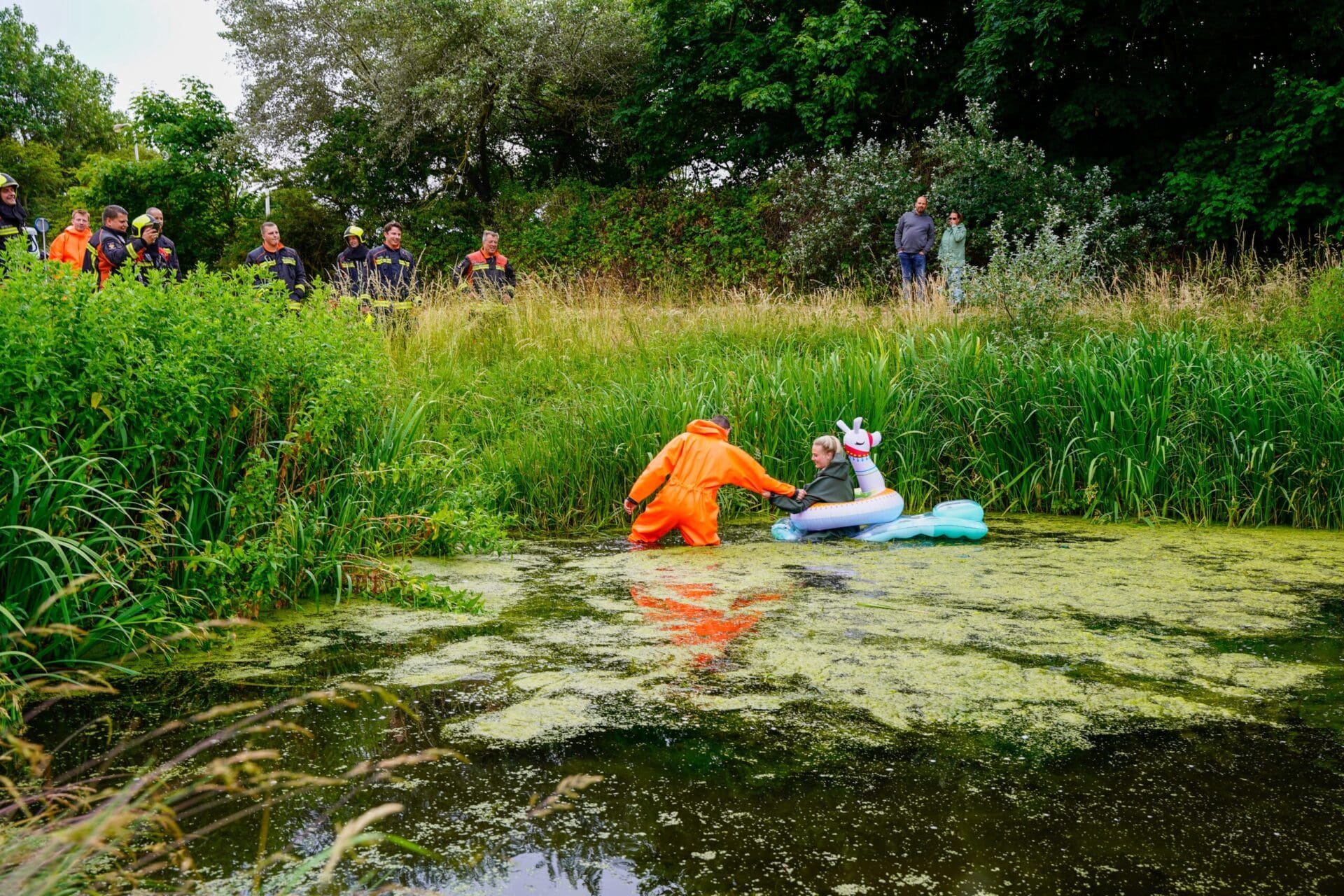 Bij aankomst van het brandweerteam troffen ze een bijzonder tafereel aan. Kees zijn eigen vrouw lag, in een opblaaspaard, in de sloot. En die moest Kees, ter ere van zijn laatste uitruk, redden. Natuurlijk in scene gezet door zijn collega’s van de brandweer.