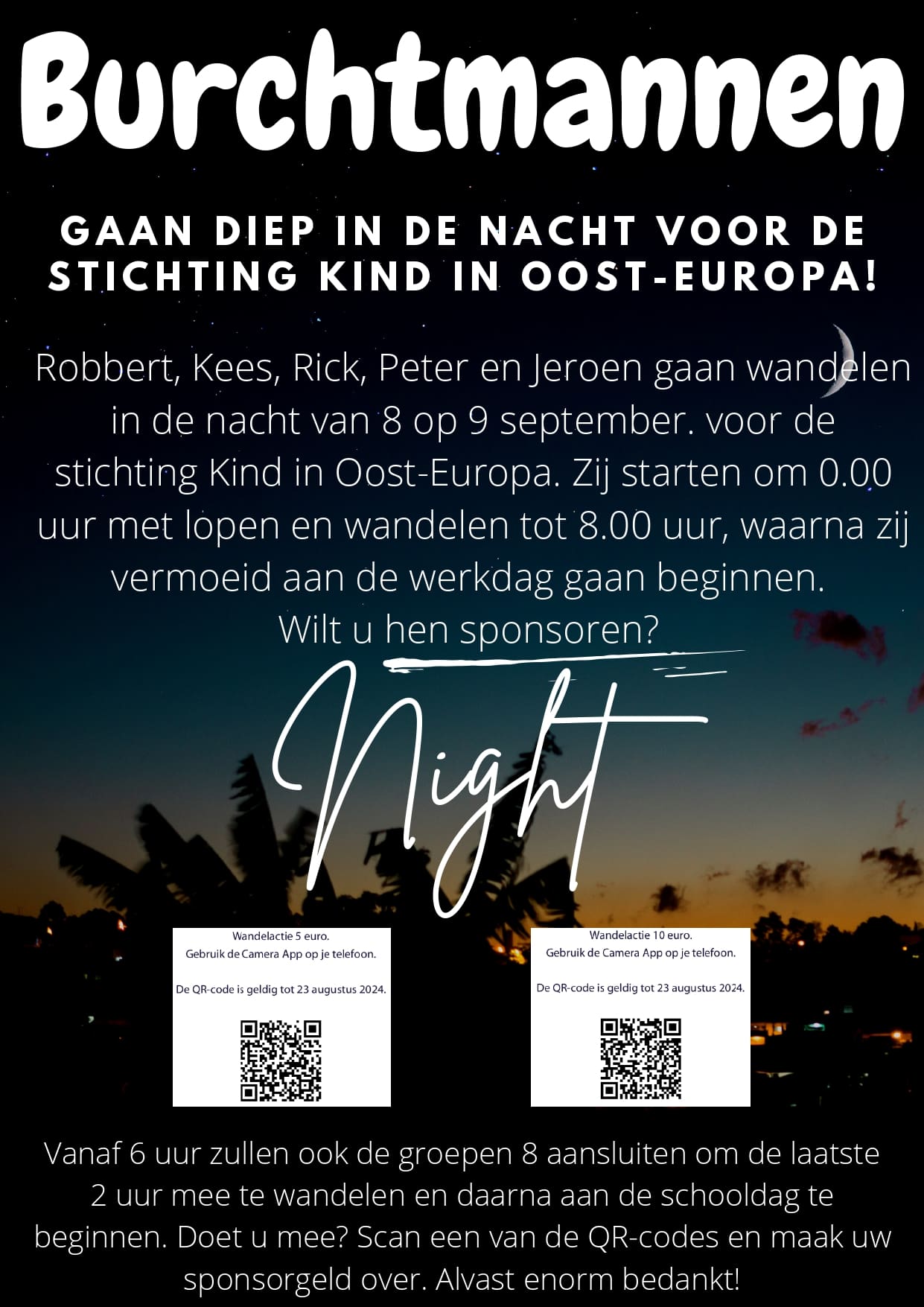 In de nacht van donderdag 8 op vrijdag 9 september gaan de leraren en directieleden van CBS De Burcht een wandeltocht maken van 35 km voor stichting Kind in Oost-Europa. Vanaf ‘s ochtends 06.00 uur lopen de kinderen van groep 8 met hen mee. Met deze sponsoractie hopen ze geld op te halen voor Stichting Kind in Oost-Europa.