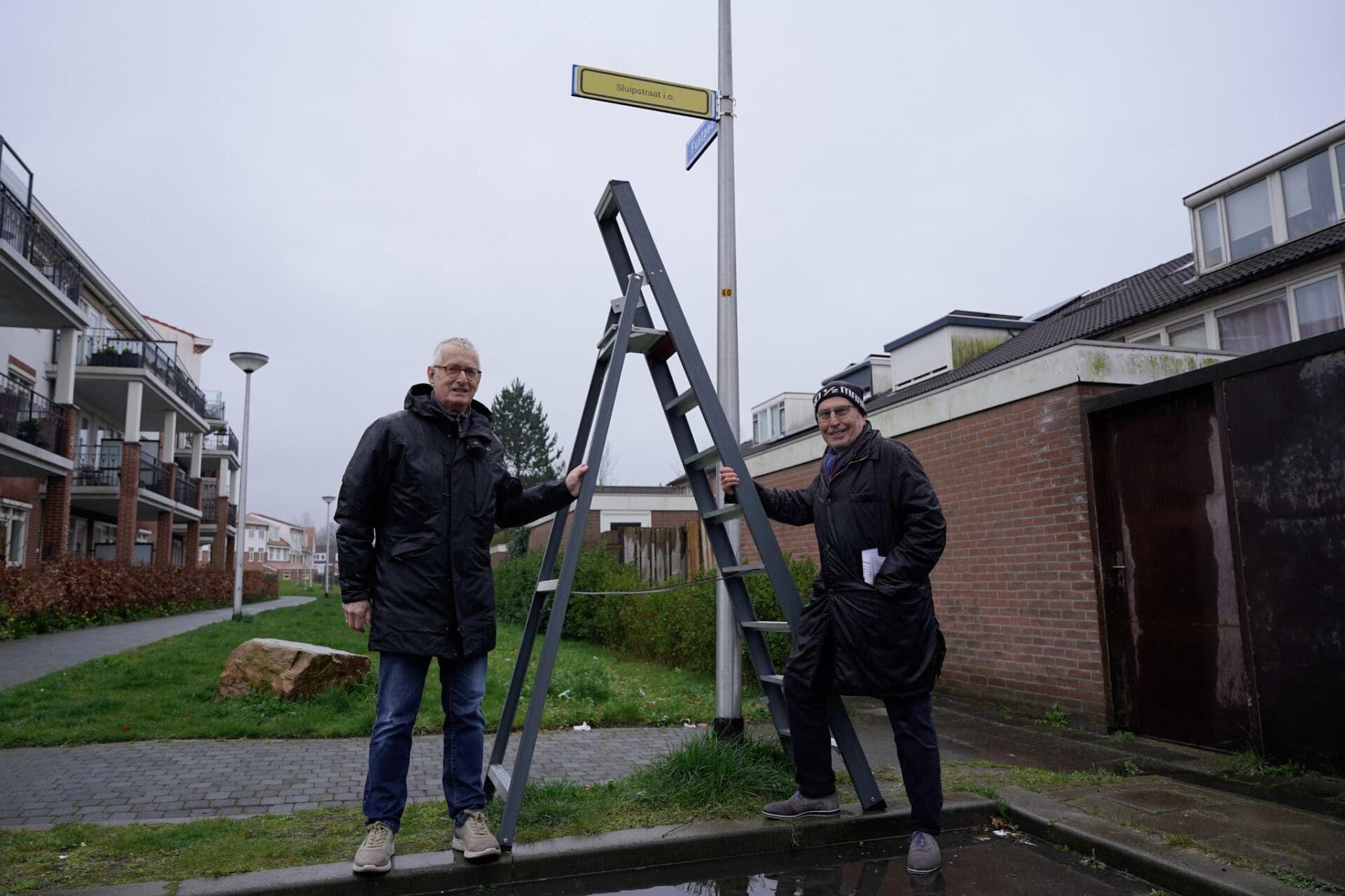 Het weer was donderdagavond even stemmig als de stemming van de bewoners. Deprimerend. Toch namen zo’n dertig omwonenden de moeite om met paraplu naar buiten te gaan. Ruud Schets en Theo Brak – de kartrekkers van de protestacties – hadden een straatnaambordje laten maken. De Exportstraat heet nu Sluipweg i.o.