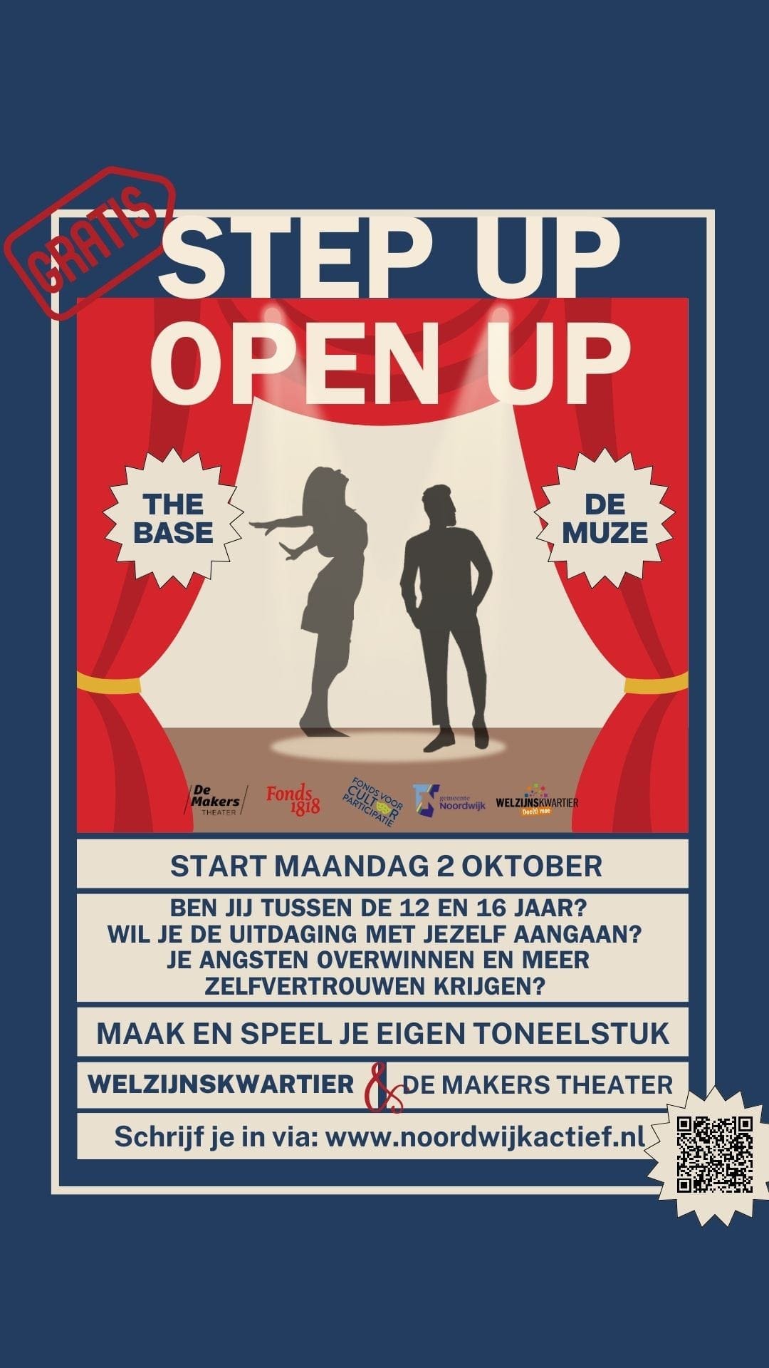 Welzijnskwartier organiseert in samenwerking met De Makers Theater ‘Step Up, Open Up’, een theaterproject waarbij jongeren samen een toneelstuk gaan maken en uitvoeren. Jongeren, tussen 12 en 16 jaar, gaan de uitdaging met zichzelf aan, overwinnen hun angsten en bouwen aan hun zelfvertrouwen.