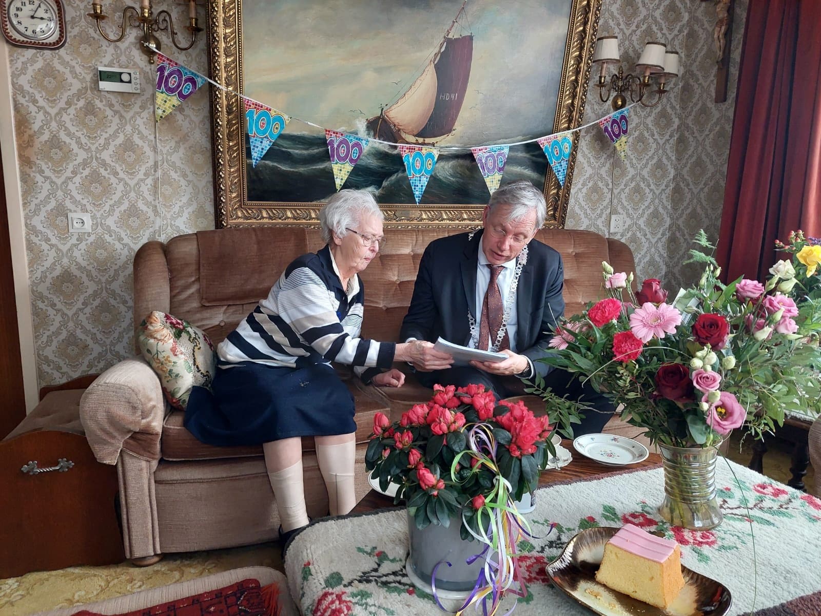 Maar liefst honderd kaarsjes mocht mevrouw Van Tol uitblazen maandag. Geboren in 1923 en inmiddels behorende tot de eeuwelingen. Naast bloemen en cadeaus bracht ook burgemeester Cornelis Visser een bezoek. Het is gebruikelijk dat de burgervader de felicitaties overbrengt namens de gemeente bij een honderdjarige.
