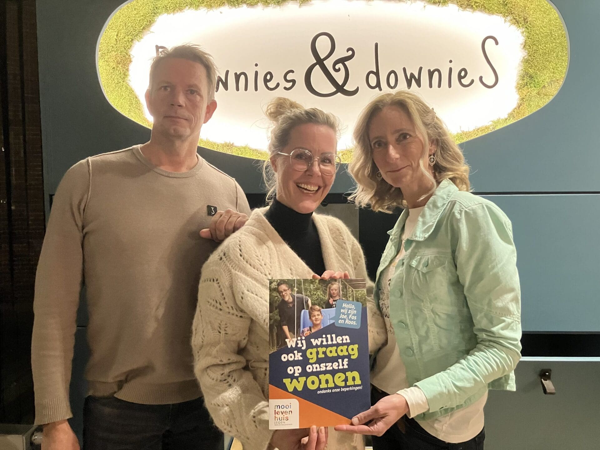 Foto: Jan van den Berg, Jolanda Volkerijk en Angela de Jong bij de presentatie van een brochure “Wij willen ook graag op onszelf wonen”.