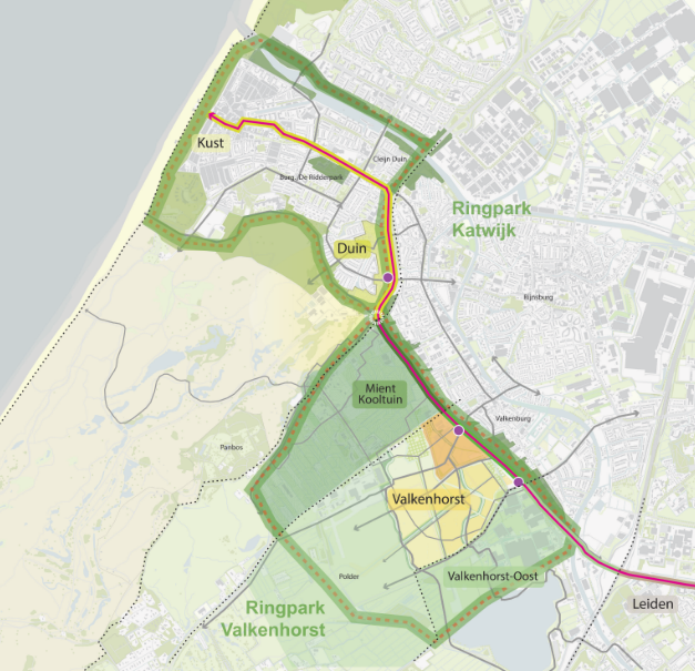 De groenzones versterken samen het Ringpark Katwijk. Dit is een netwerk van groene linten rond de dorpskernen. De ringen komen samen bij de nieuwe fietstunnel onder de N206. Er is veel aandacht voor biodiversiteit. Langs de busbaan komen inheemse planten en speciale plekken voor dieren, zoals insectenwanden en vleermuispalen. Op bredere stukken komen wandelpaden, zitplekken en speelvoorzieningen.