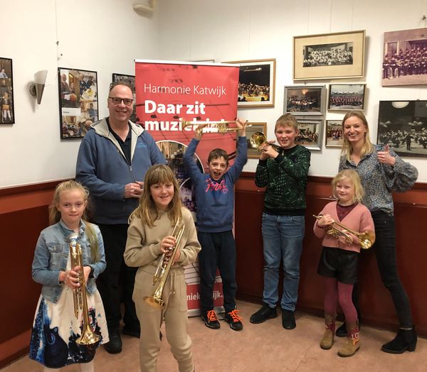 Op de foto een paar leerlingen van het leerlingenorkest met de nieuwe aanwinsten, vergezeld van Marcel Schot (Atelier Pfeiffer) en Monique van Rijn (bestuurslid Harmonie Katwijk).