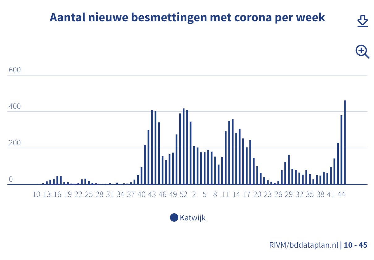 Twee Katwijkers zijn vorige week in het ziekenhuis opgenomen; één Katwijker is overleden aan de gevolgen van het coronavirus. In totaal hebben tenminste 65 Katwijkers het leven gelaten aan de gevolgen van het coronavirus. 304 hebben in het ziekenhuis gelegen.
