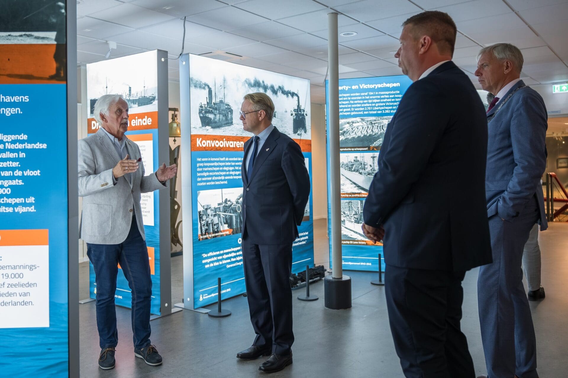 Vrijdag 5 september bezocht minister Robert Tieman van Infrastructuur en Waterstaat de expositie ‘Varen voor Vrijheid’ in het Katwijks Museum. Hij werd rondgeleid door Hubert Nijgh, voorzitter van de Stichting Koopvaardijpersoneel 1940-1945, en Jacob Haasnoot, voorzitter van de Expositiecommissie. Zij namen de minister mee langs de banners die een beeld geven van de onmisbare rol van de Nederlandse koopvaardij in de Tweede Wereldoorlog. Ook minister Tieman werd bij het zien van de beelden en het horen van het daarbij behorende verhaal enorm geïmponeerd. Ook hij verwonderde zich erover dat dit belangrijke onderdeel van onze Nationale geschiedenis zo onderbelicht is gebleven, terwijl de koopvaardij de belangrijkste Nederlandse bijdrage heeft geleverd aan de bevrijding van Europa en Azië. Dit is al het tweede bezoek van een minister in een tijdsbestek van nog geen maand. Minister Ruben Brekelmans van Defensie deed dat op 12 augustus jl. Deze bezoeken onderstrepen het belang van de expositie, die inmiddels 8.500 bezoekers trok. Afgelopen week bezocht ook een groep van 32 oud-burgemeesters en parlementariërs de expositie. De grote belangstelling vormt de reden dat de expositie wordt verlengd. De expositie zou aanvankelijk t/m 7 september 2025 lopen, maar wordt wegens groot succes geprolongeerd t/m 15 maart 2026. Er worden nieuwe objecten toegevoegd, zoals schaalmodellen van de zeesleepboten Zwarte Zee en Roode Zee en een onderzeeboot