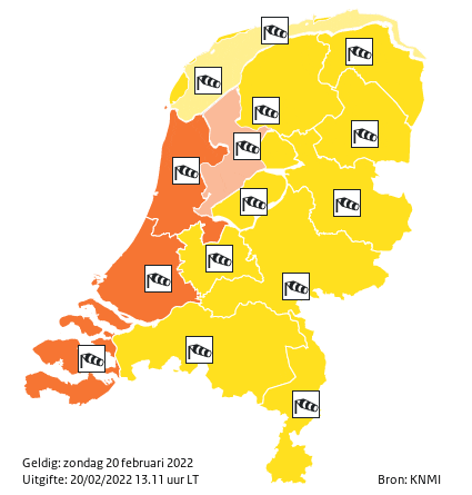 Het KNMI waarschuwt zondag en maandag opnieuw voor zware windstoten. Het weerinstituut heeft voor zondagavond code oranje afgegeven.