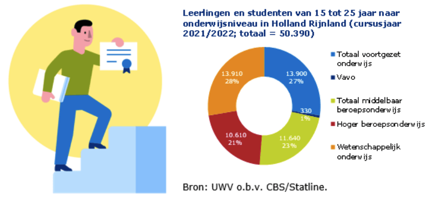 Op dit moment zijn er 70.000 jongeren tussen 15 en 25 jaar in Holland Rijnland. Van deze groep zijn er 58.000 jongeren (83%) aan het werk of voor werk beschikbaar. 54.000 jongeren van deze groep werken ook daadwerkelijk. Ruim twee derde van deze jongeren werkt in een baan met routinematige taken of weinig tot middelmatig complexe taken. Een groot aantal van deze jongeren volgt ook nog een opleiding om uiteindelijk een baan te vinden die past bij de opleiding die zij volgen. Want 74% van de werkzame jongeren in Nederland volgt nog een vorm van onderwijs op vo, mbo, hbo, wo. Daar liggen kansen voor werkgevers om de toekomst van het bedrijf zeker te stellen.