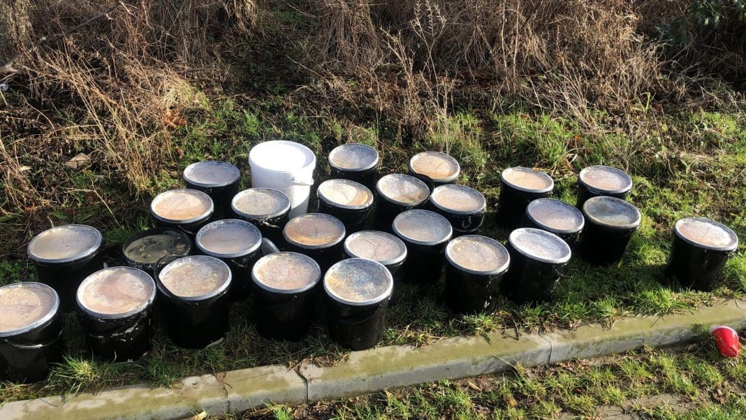 Een woordvoerder van de politie wil kwijt dat het om ‘voedselmiddelen’ gaat, en gelukkig geen drugsafval. De gemeente Katwijk gaat de emmers weghalen. Wie de ‘voedseldumping’ op zijn of haar geweten heeft, is niet bekend.
