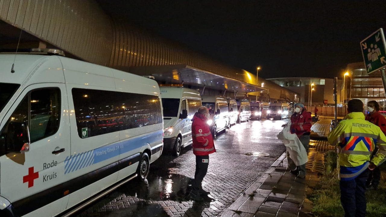 Reizigers die positief zijn getest, zijn door het Rode Kruis met busjes naar een isolatiehotel gebracht. Dat is een hotel op of nabij Schiphol.