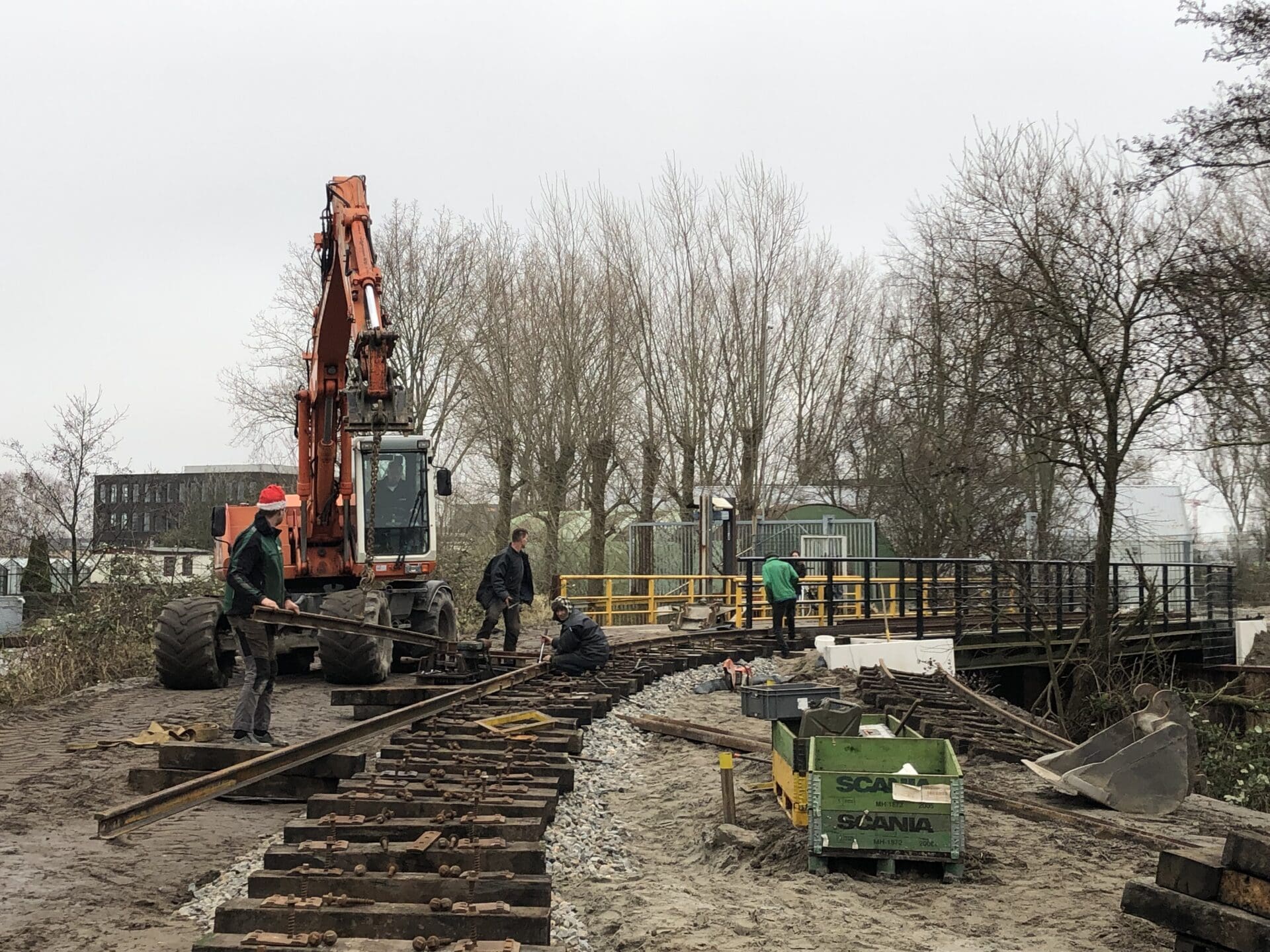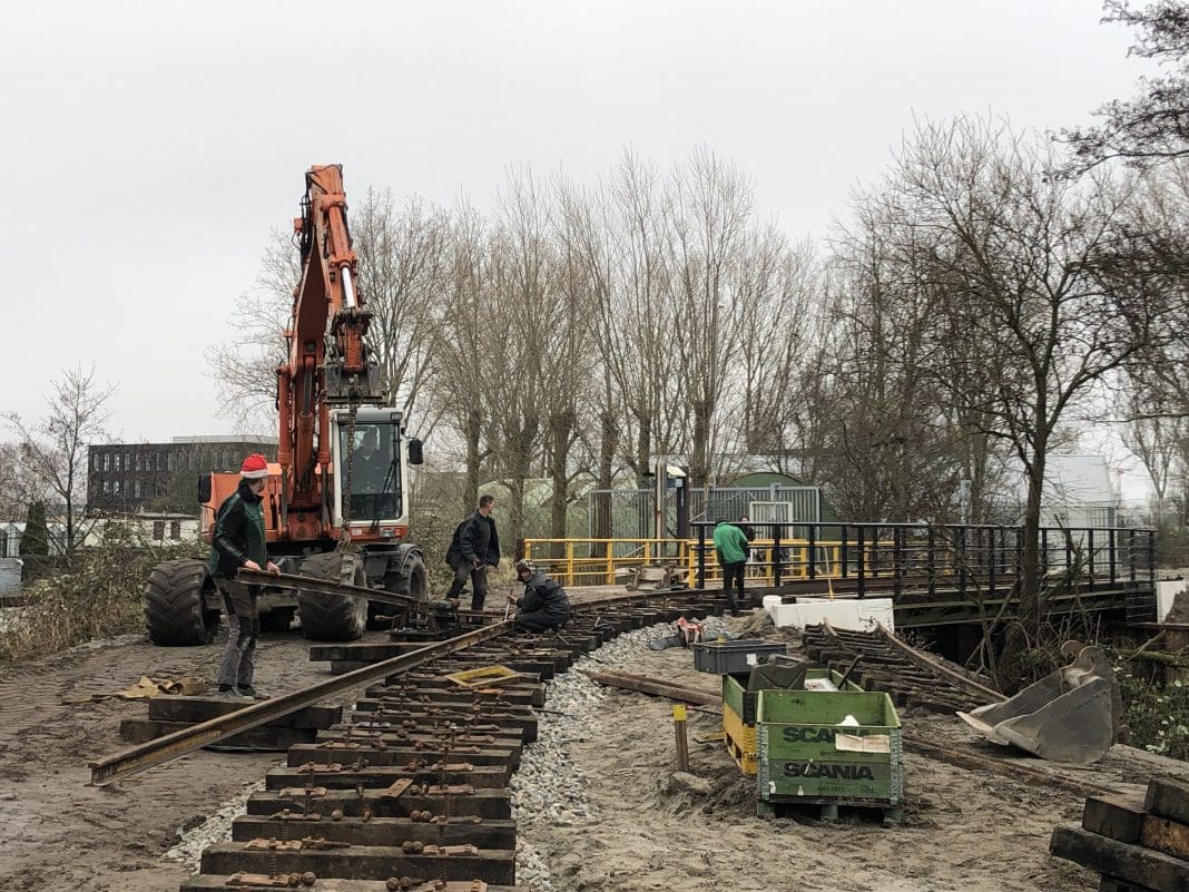Zoals zo vaak zit het venijn in de staart. Die laatste 200 meter spoor tot de brug zijn bijzonder uitdagende meters met heel veel grondwerk inclusief hellingen en bochten. En de zandwinner moest in het nieuwe jaar het spoor weer kunnen kruisen met machines en vrachtwagens.