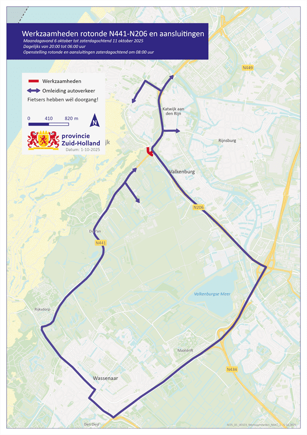 Tussen 6 en 11 oktober is de rotonde elke avond en nacht dicht van 20:00 tot 06:00 uur. De rotonde is dan voor auto’s afgesloten in alle richtingen. Fietsers worden door verkeersregelaars langs de werkzaamheden geleid. Overdag, tussen 06:00 en 20:00 uur is de rotonde wel open (behalve de aansluiting met de N441/N206).
