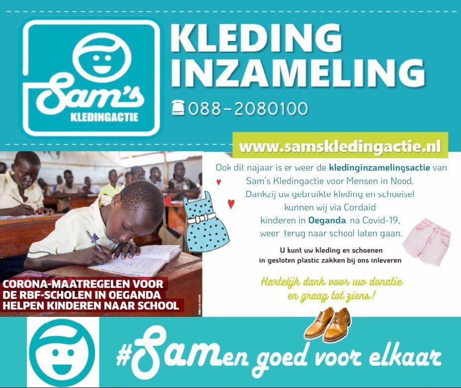 Ieder voorjaar en najaar organiseert Sam’s Kledingactie een aantal speciale landelijke actiedagen, om zo extra veel kleding op te kunnen halen voor het goede doel. Deze keer is er gekozen voor hulp aan schoolkinderen en hun ouders in Oeganda zodat zij, wanneer Corona voorbij is, weer terug naar school kunnen.