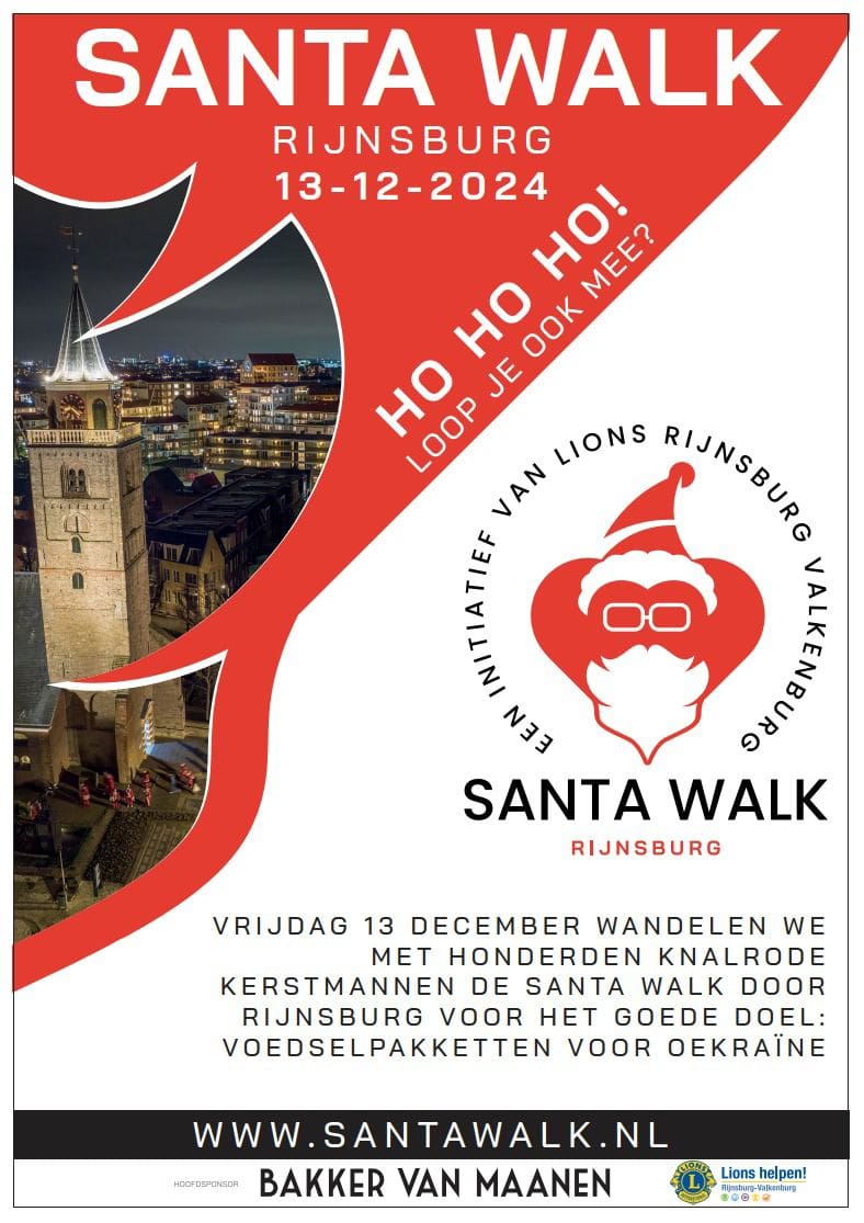 Op vrijdag 13 december is het zover: Lionsclub Rijnsburg-Valkenburg organiseert de Santa Walk 2024. Voor de tweede keer trekken honderden kerstmannen en -vrouwen door de sfeervolle straten van Rijnsburg. Het belooft een unieke en gezellige wandeling te worden, waarbij deelnemers in hun iconische kerstpakken niet alleen het dorp in feestelijke sferen hullen, maar ook bijdragen aan een goed doel.