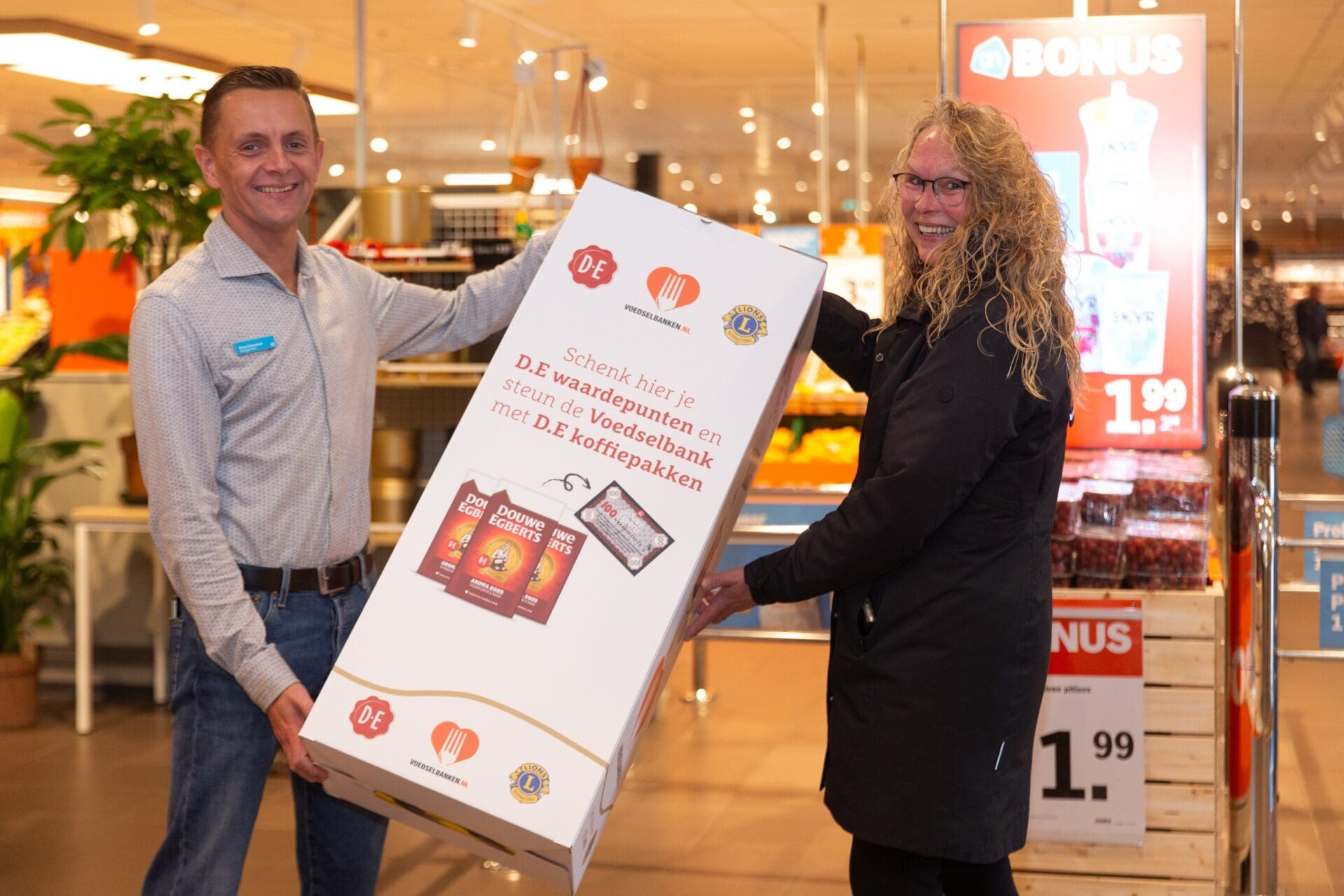 Vrijwilliger van de Voedselbank Alice de Vreugd overhandigde deze week de eerste doos aan manager René Antonisse van de versafdeling. Bij de ingang komt een grote doos te staan waar bezoekers hun DE-koffie en theepunten tot 5 januari 2024 in kunnen leveren.