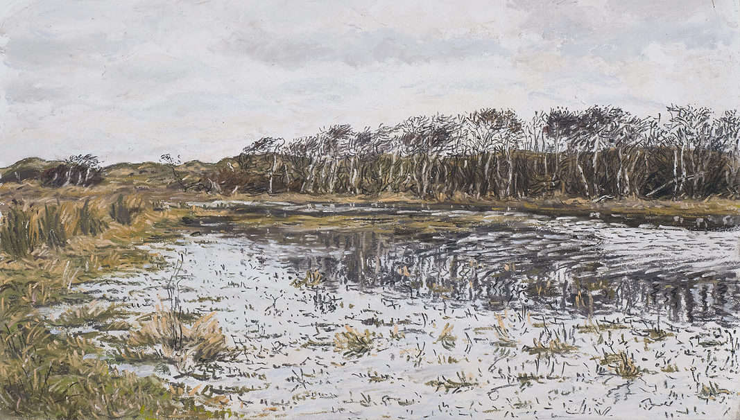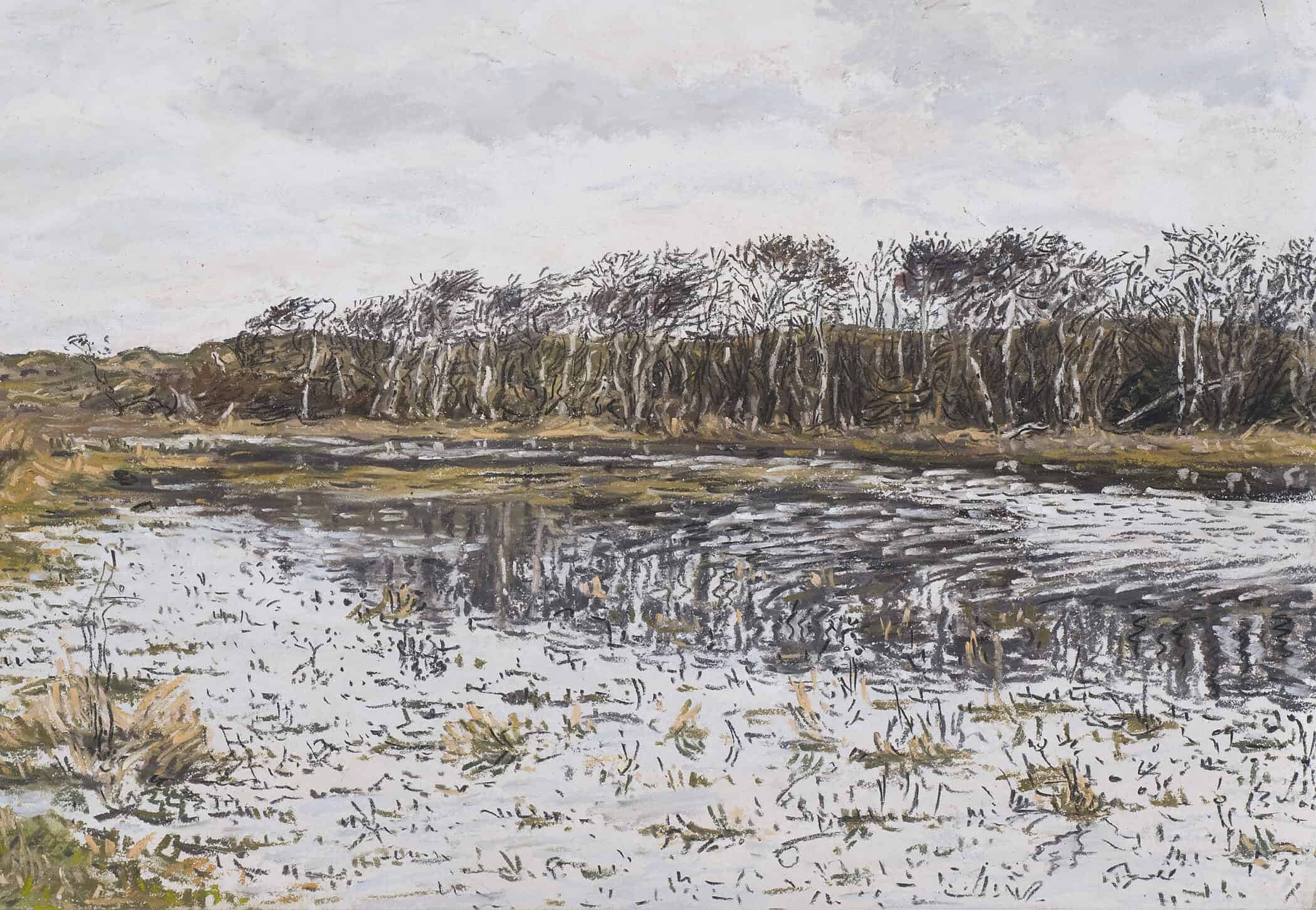 Joanna Quispel: ‘Als ik water teken of schilder probeer ik zo min mogelijk na te denken, me enorm te concentreren en zoveel mogelijk mee te golven met de beweging. Je kan het nou eenmaal niet vastleggen. Wel zijn er hulpmiddelen die helpen water te suggereren. Spiegeling bijvoorbeeld helpt altijd. Soms is weerspiegeling ook mijn onderwerp. Helaas is het me al vaak overkomen dat de wind dat onderwerp halverwege mijn tekening aan gruzelementen blies. Zodat ik wel weer in kon pakken.’