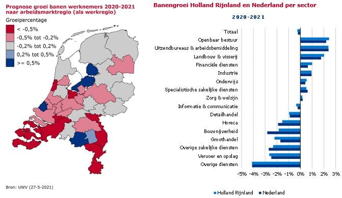 In 2020 verdwenen in Holland Rijnland 1.800 werknemersbanen (-0,8%). Hiermee ging het totaal aantal banen van 227.300 banen in 2019 naar 225.500 in 2020. De coronacrisis trof vooral werknemers die via uitzendbureaus werkten of in de horeca. In totaal gingen in deze sectoren zo’n 3.400 regionale banen verloren. Er was echter ook groei in 2020. Vooral in de collectieve sectoren (zorg & welzijn, onderwijs en openbaar bestuur) nam de werkgelegenheid toe, in totaal met zo’n 1.800 banen. Verder was er sprake van bescheiden banengroei in bouw, ICT, detailhandel en financiële diensten. In deze vier sectoren kwamen er opgeteld ongeveer 500 banen bij.