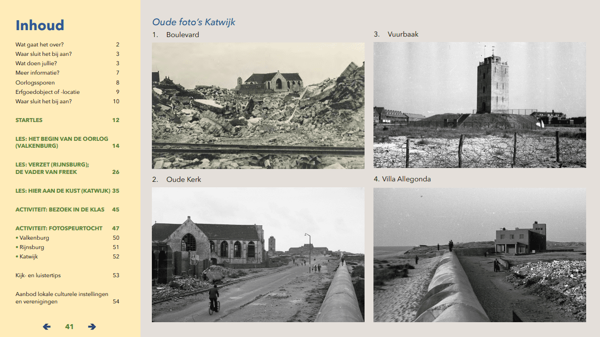 De lesbrief Oorlogssporen is vernieuwd. Dit lesprogramma, bedoeld voor groep 6 tot en met 8 van de basisschool, laat leerlingen de lokale geschiedenis van de Tweede Wereldoorlog in Katwijk, Rijnsburg en Valkenburg ontdekken. Deze lesbrief wordt vanaf begin april aangeboden aan de basisscholen in de gemeente Katwijk.