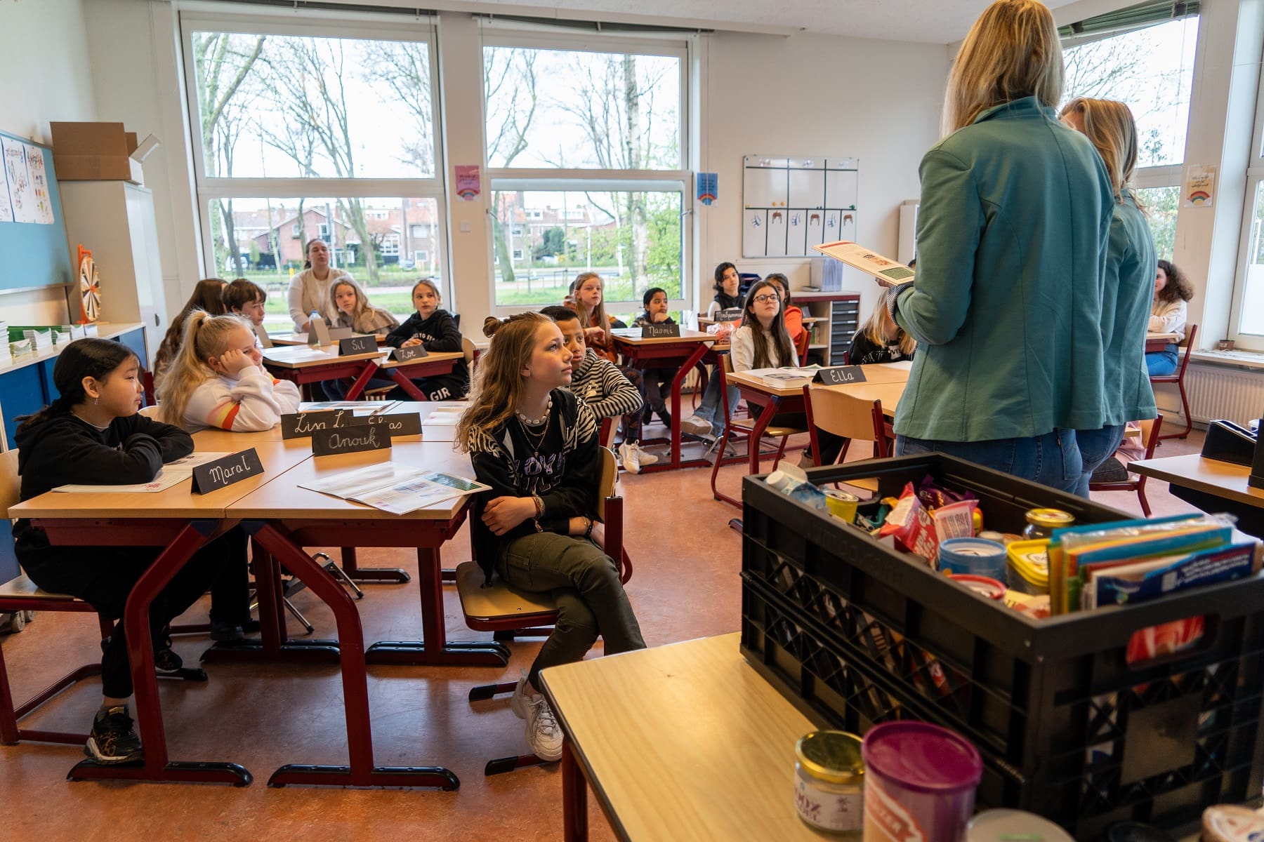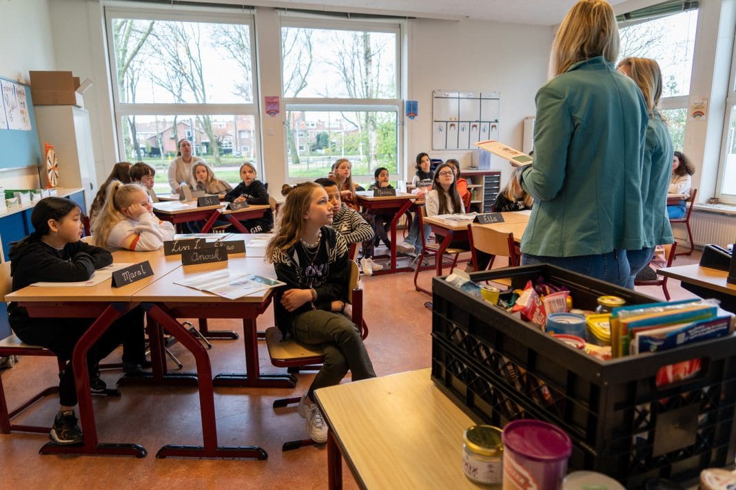 ‘Vandaag gaan we naar groep zeven. Vandaag hebben we de etiketten check. We worden vaak misleid door wat er in de winkel staat. Draai eens een product om, wat zit er in? Dan is het soms wel even schrikken. Super belangrijk om dat te checken. Dat leren we de kinderen vandaag.’