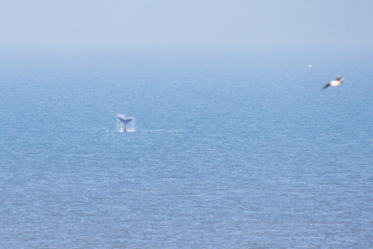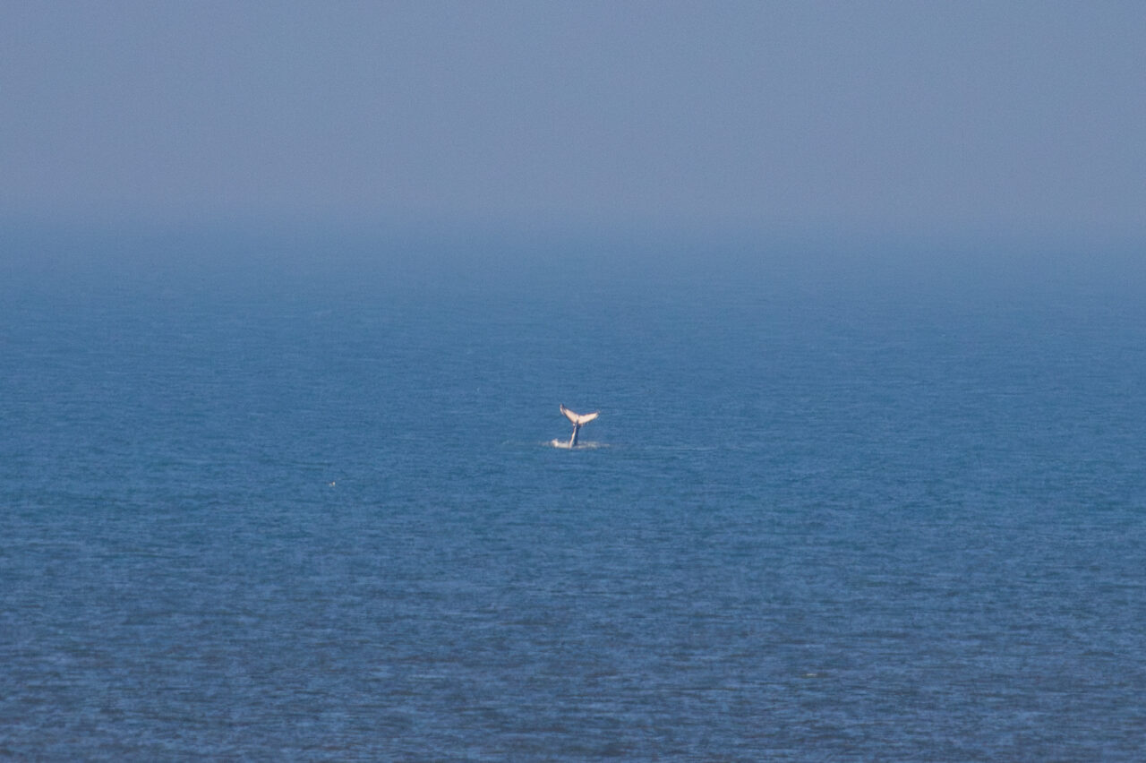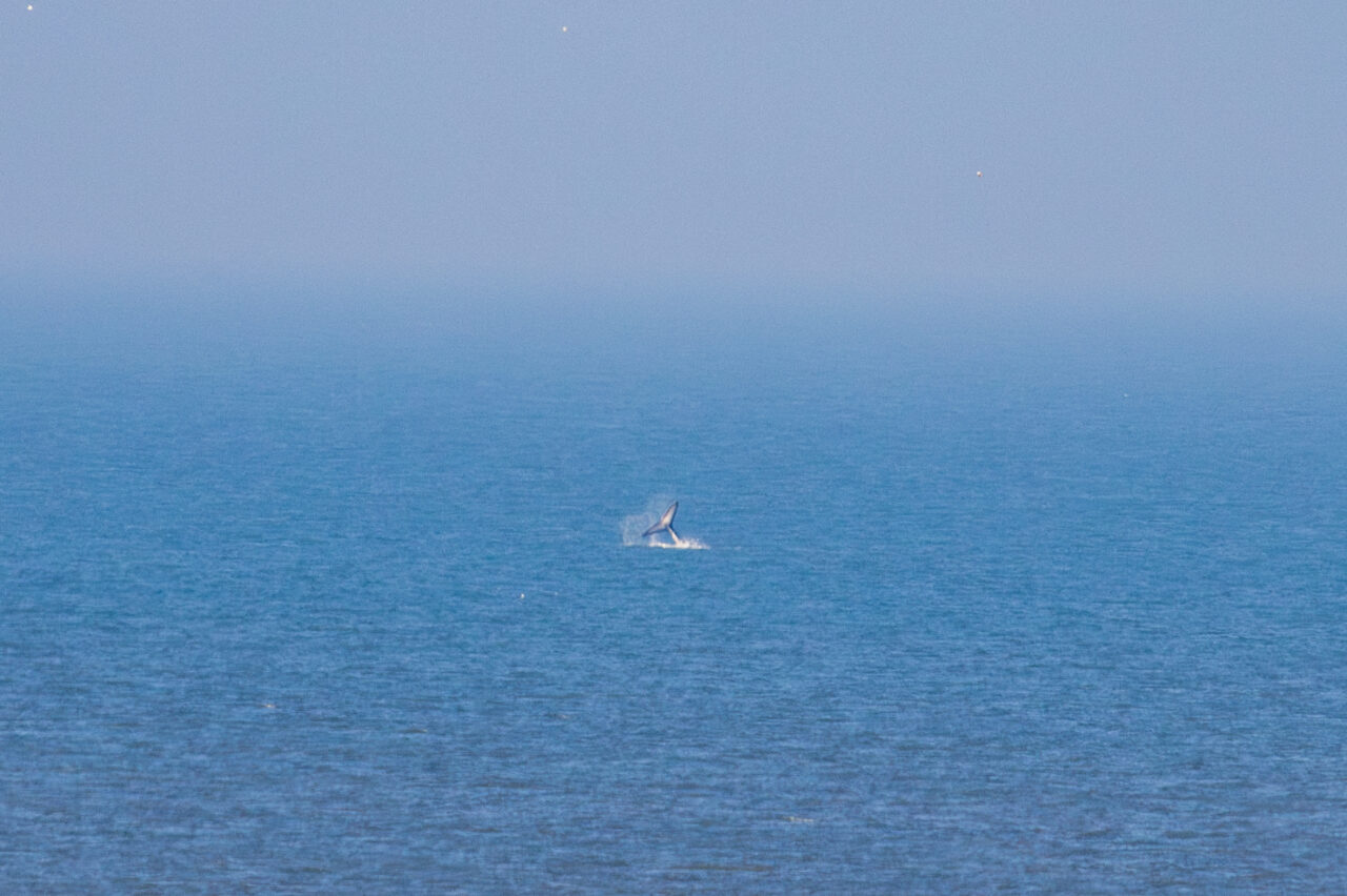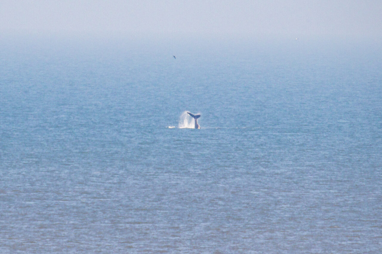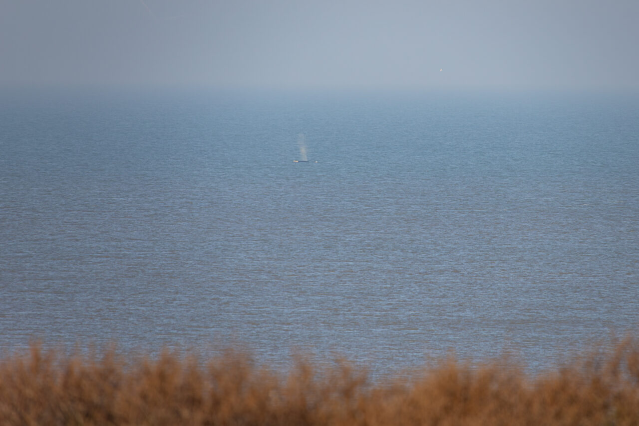 De bultrug wordt gekenmerkt door een grote witte vlek dichtbij de rugvin. Het dier ligt op een flinke afstand van de kust, aldus fotograaf Corné Ouwehand.