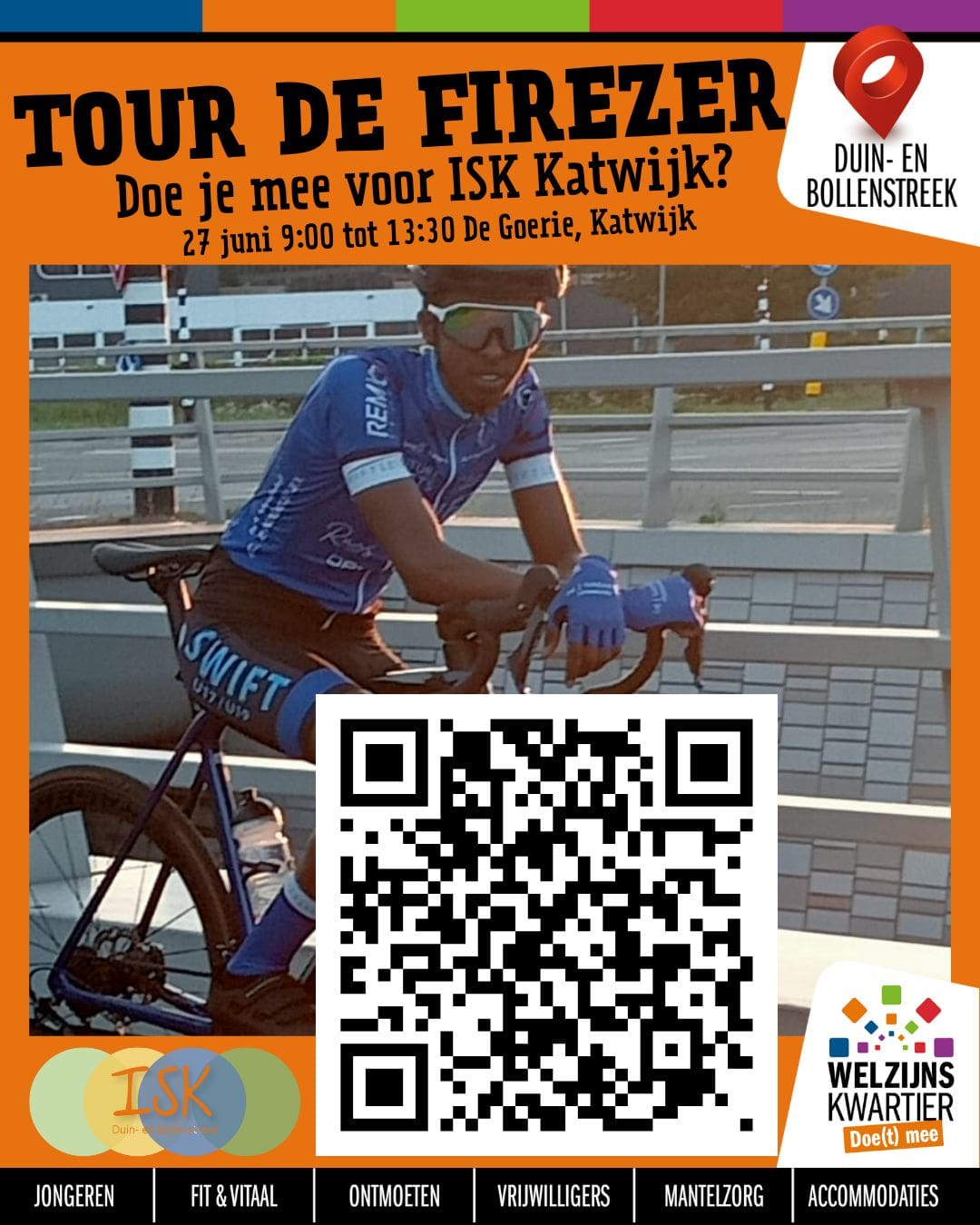 Op vrijdag 27 juni organiseert de 18-jarige Eritrese wielrenner Firezer een bijzonder fietsevenement op wielerbaan De Goerie in Katwijk. Van 9:45 tot 13:00 uur fietsen leerlingen en leraren van de Internationale Schakel Klas (ISK Katwijk) rondjes om geld in te zamelen voor betere faciliteiten op hun school. Wethouder Sonny Spek geeft het startschot voor deze sportieve inzamelingsactie.
