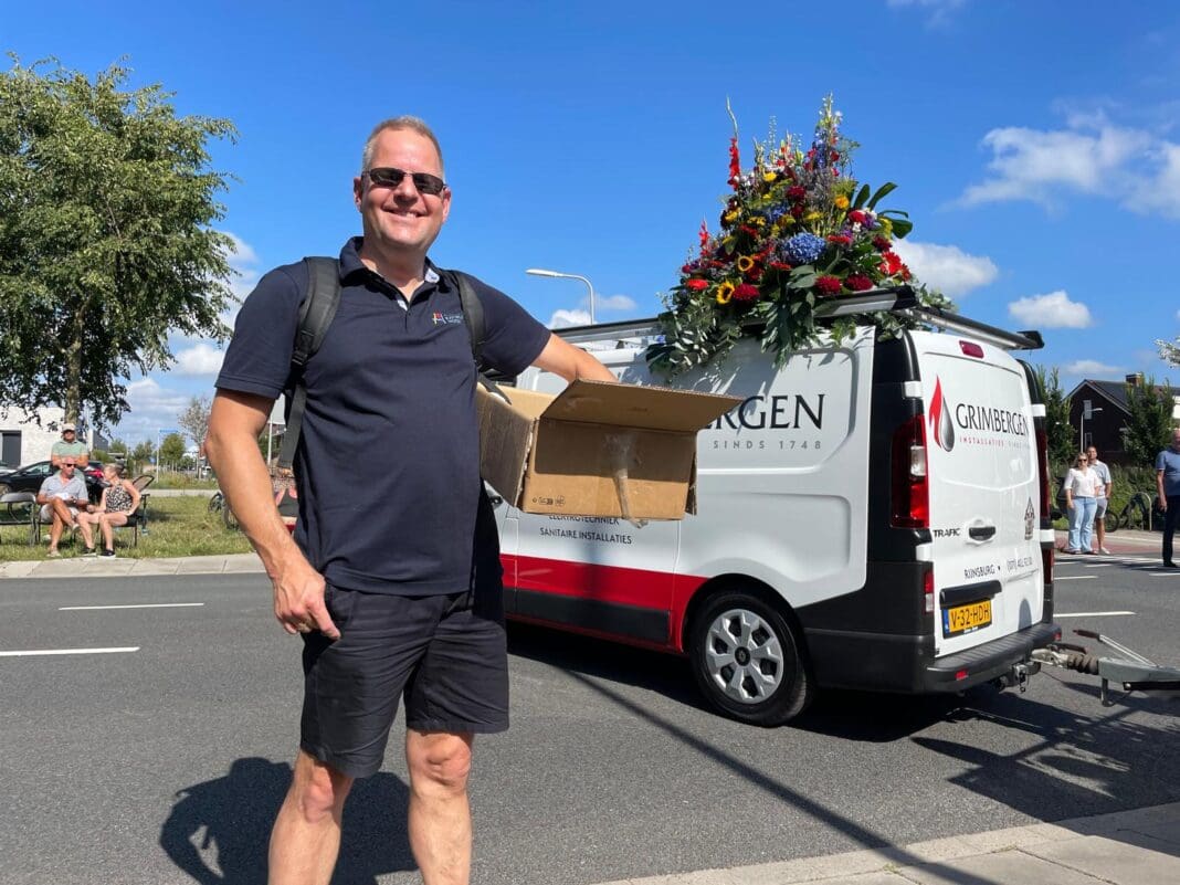 Foto: wijkraadsvoorzitter Jonathan Weegink deelt groeikaarten met QR-code van de community uit tijdens de Flower Parade Rijnsburg.