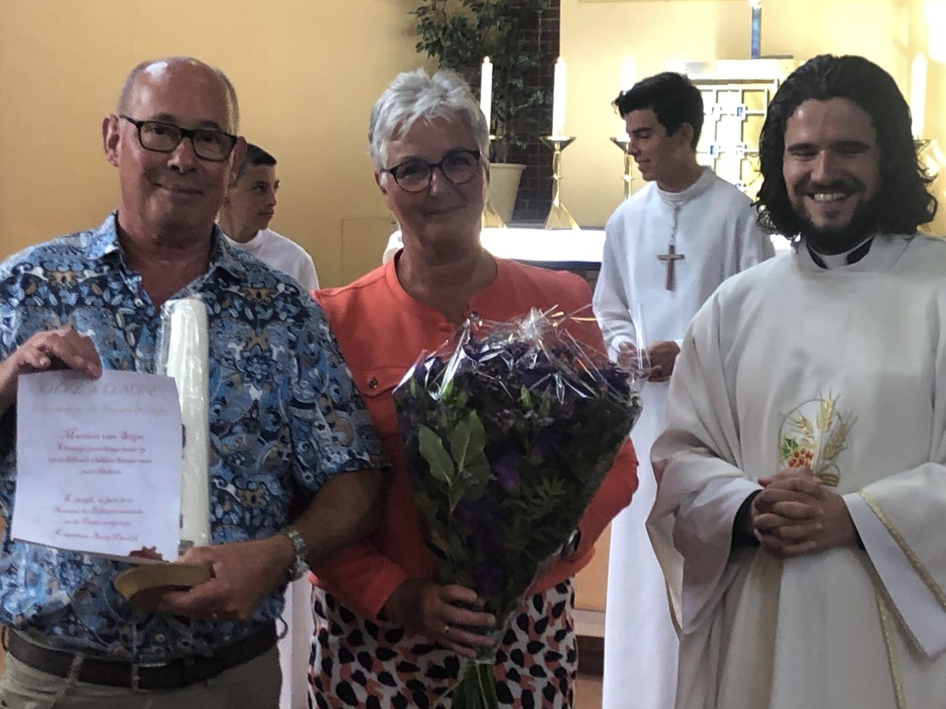 Een zoekende camera in de livestream van de Sint Jansviering 20 juni in parochiekern H. Joannes de Doper in Katwijk ging langs alle zestig kerkgangers, maakte onverwachte bewegingen maar… stopte bij Martien van Stijn. Daarmee was hij gezocht en gevonden als de ‘Vrijwilliger van het jaar’. Totaal verrast kwam hij naar voren om na een mooie toespraak van kapelaan Boris Plavcic de parochiekaars en een oorkonde in ontvangst te mogen nemen. Waarbij de bloemen er natuurlijk voor zijn vrouw waren, voor alle uren dat hij wekelijks als bevlogen vrijwilliger op pad is.